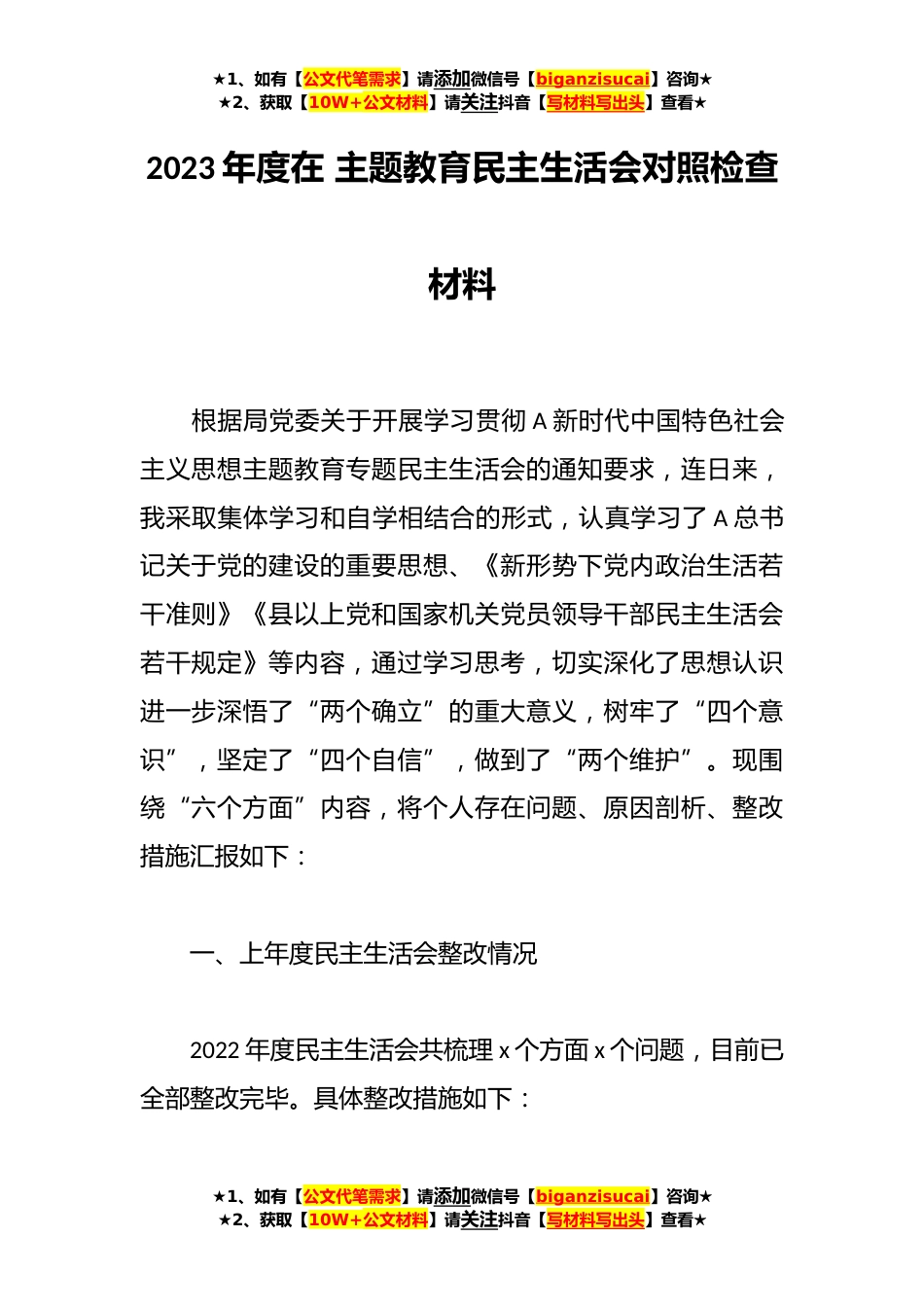 ★1、如有【公文代笔需求】请添加微信号【biganzisucai】咨询★★2、获取【10W+公文材料】请关注抖音【写材料写出头】查看★2023年度在主题教育民主生活会对照检查材料根据局党委关于开展学习贯彻A新时代中国特色社会主义思想主题教育专题民主生活会的通知要求,连日来,我采取集体学习和自学相结合的形式,认真学习了A总书记关于党的建设的重要思想、《新形势下党内政治生活若干准则》《县以上党和国家机关党员领导干部民主生活会若干规定》等内容,通过学习思考,切实深化了思想认识进一步深悟了“两个确立”的重大意义,树牢了“四个意识”,坚定了“四个自信”,做到了“两个维护”。现围绕“六个方面”内容,将个人存在问题、原因剖析、整改措施汇报如下:一、上年度民主生活会整改情况2022年度民主生活会共...