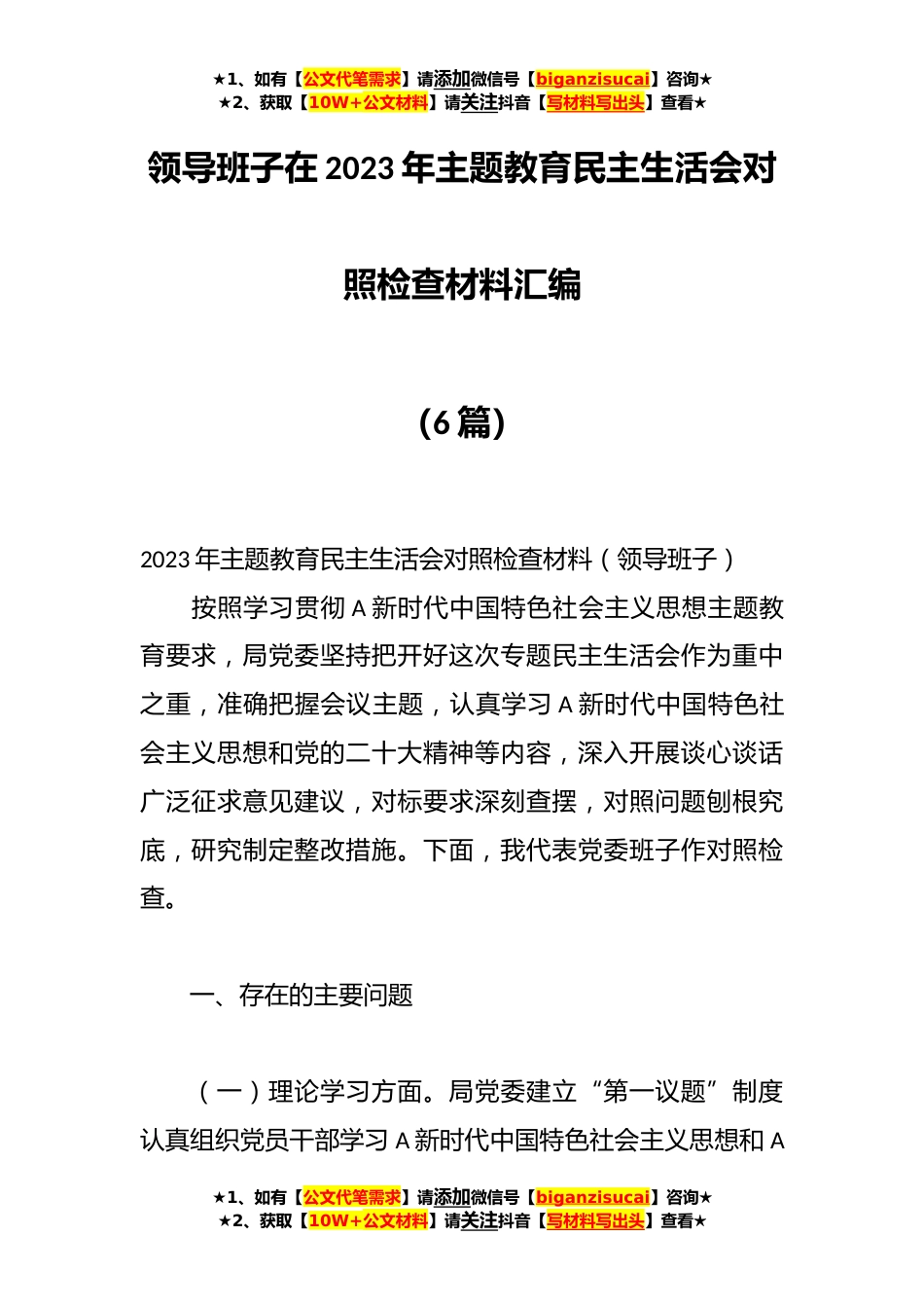 ★1、如有【公文代笔需求】请添加微信号【biganzisucai】咨询★★2、获取【10W+公文材料】请关注抖音【写材料写出头】查看★领导班子在2023年主题教育民主生活会对照检查材料汇编(6篇)2023年主题教育民主生活会对照检查材料(领导班子)按照学习贯彻A新时代中国特色社会主义思想主题教育要求,局党委坚持把开好这次专题民主生活会作为重中之重,准确把握会议主题,认真学习A新时代中国特色社会主义思想和党的二十大精神等内容,深入开展谈心谈话广泛征求意见建议,对标要求深刻查摆,对照问题刨根究底,研究制定整改措施。下面,我代表党委班子作对照检查。一、存在的主要问题(一)理论学习方面。局党委建立“第一议题”制度认真组织党员干部学习A新时代中国特色社会主义思想和A★1、如有【公文代笔需求】请添...