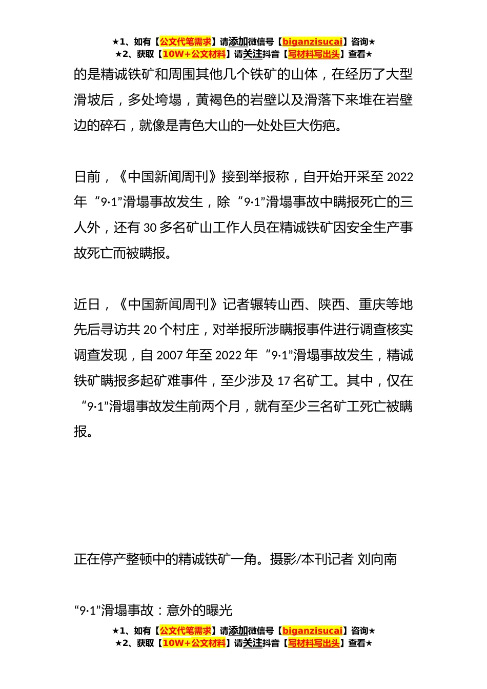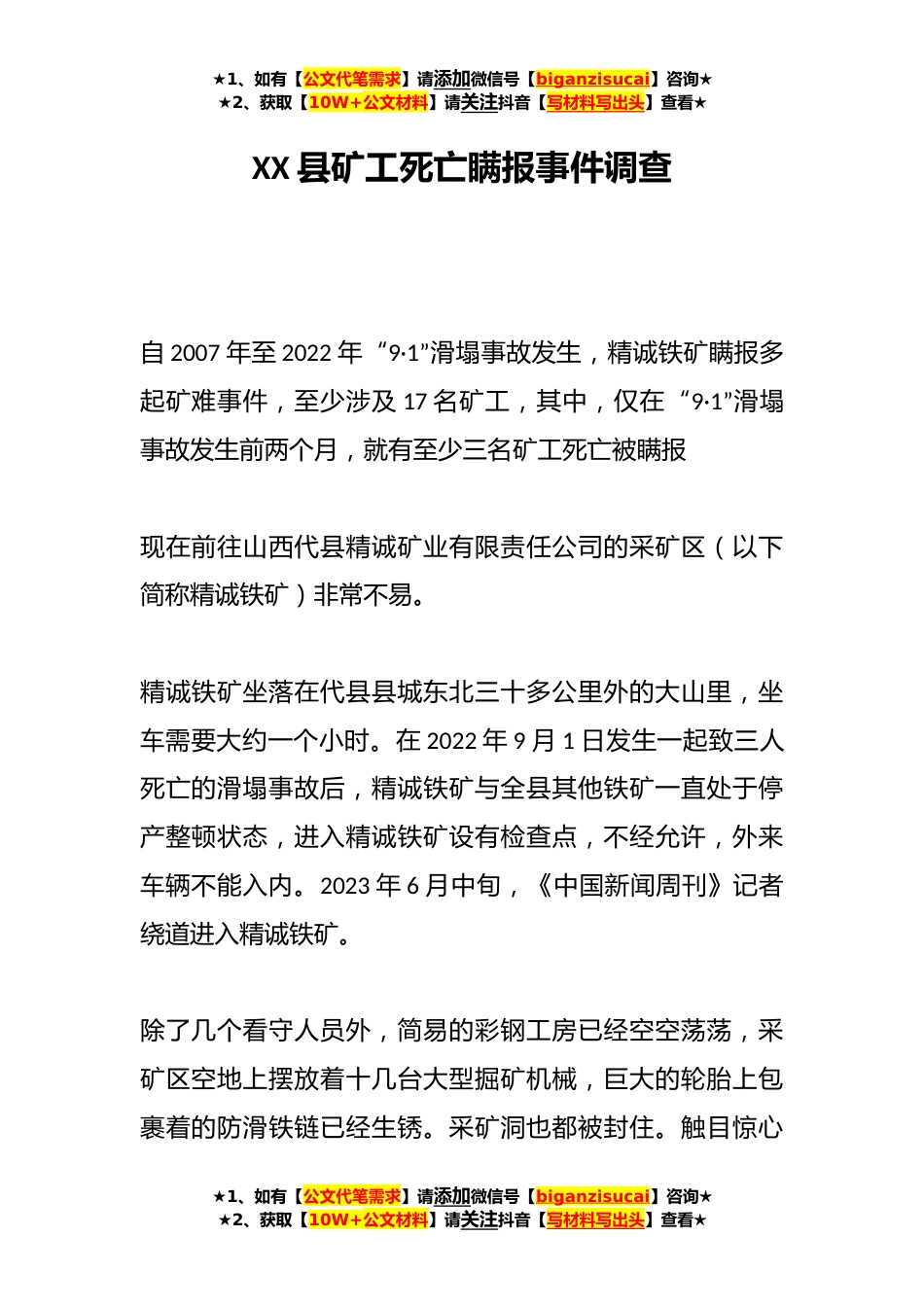 ★1、如有【公文代笔需求】请添加微信号【biganzisucai】咨询★★2、获取【10W+公文材料】请关注抖音【写材料写出头】查看★XX县矿工死亡瞒报事件调查自2007年至2022年“9·1”滑塌事故发生,精诚铁矿瞒报多起矿难事件,至少涉及17名矿工,其中,仅在“9·1”滑塌事故发生前两个月,就有至少三名矿工死亡被瞒报现在前往山西代县精诚矿业有限责任公司的采矿区(以下简称精诚铁矿)非常不易。精诚铁矿坐落在代县县城东北三十多公里外的大山里,坐车需要大约一个小时。在2022年9月1日发生一起致三人死亡的滑塌事故后,精诚铁矿与全县其他铁矿一直处于停产整顿状态,进入精诚铁矿设有检查点,不经允许,外来车辆不能入内。2023年6月中旬,《中国新闻周刊》记者绕道进入精诚铁矿。除了几个看守人员外,简易的彩钢工房已...
