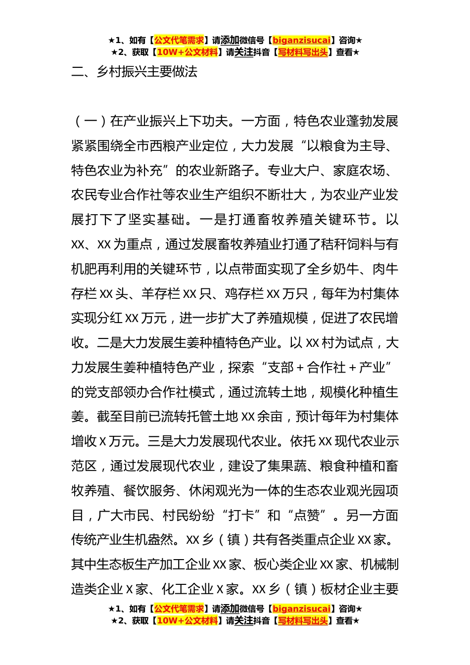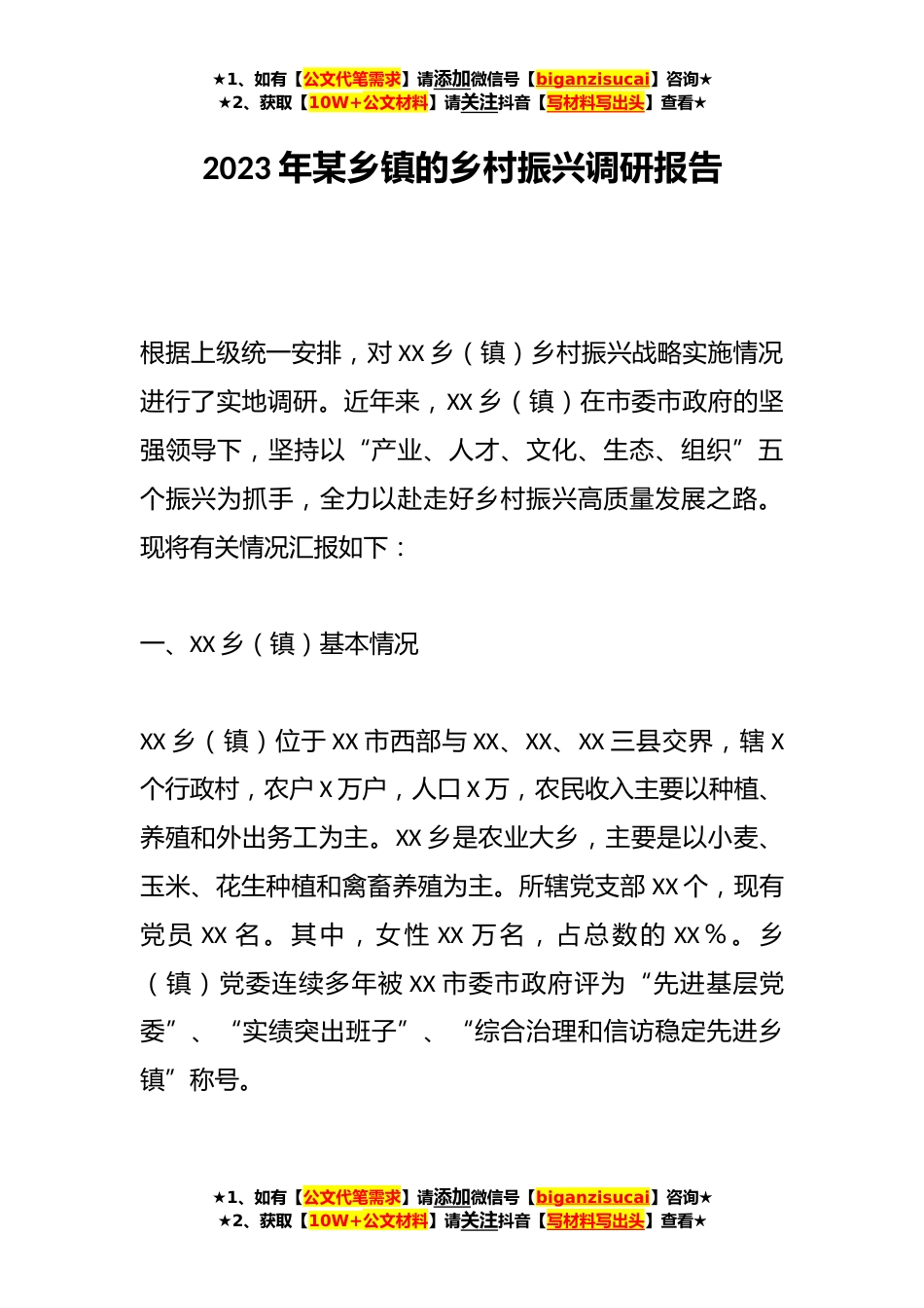 ★1、如有【公文代笔需求】请添加微信号【biganzisucai】咨询★★2、获取【10W+公文材料】请关注抖音【写材料写出头】查看★2023年某乡镇的乡村振兴调研报告根据上级统一安排,对XX乡(镇)乡村振兴战略实施情况进行了实地调研。近年来,XX乡(镇)在市委市政府的坚强领导下,坚持以“产业、人才、文化、生态、组织”五个振兴为抓手,全力以赴走好乡村振兴高质量发展之路。现将有关情况汇报如下:一、XX乡(镇)基本情况XX乡(镇)位于XX市西部与XX、XX、XX三县交界,辖X个行政村,农户X万户,人口X万,农民收入主要以种植、养殖和外出务工为主。XX乡是农业大乡,主要是以小麦、玉米、花生种植和禽畜养殖为主。所辖党支部XX个,现有党员XX名。其中,女性XX万名,占总数的XX%。乡(镇)党委连续多年被XX市委市政府...