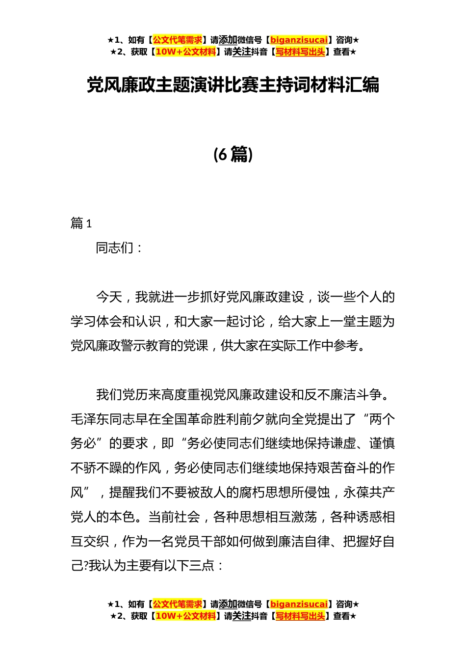 ★1、如有【公文代笔需求】请添加微信号【biganzisucai】咨询★★2、获取【10W+公文材料】请关注抖音【写材料写出头】查看★党风廉政主题演讲比赛主持词材料汇编(6篇)篇1同志们:今天,我就进一步抓好党风廉政建设,谈一些个人的学习体会和认识,和大家一起讨论,给大家上一堂主题为党风廉政警示教育的党课,供大家在实际工作中参考。我们党历来高度重视党风廉政建设和反不廉洁斗争。毛泽东同志早在全国革命胜利前夕就向全党提出了“两个务必”的要求,即“务必使同志们继续地保持谦虚、谨慎不骄不躁的作风,务必使同志们继续地保持艰苦奋斗的作风”,提醒我们不要被敌人的腐朽思想所侵蚀,永葆共产党人的本色。当前社会,各种思想相互激荡,各种诱惑相互交织,作为一名党员干部如何做到廉洁自律、把握好自己?我认...