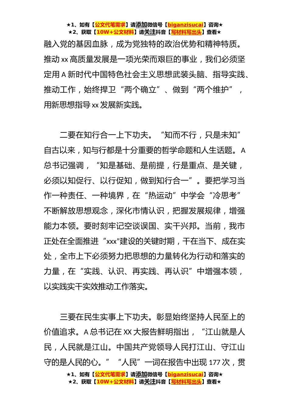 ★1、如有【公文代笔需求】请添加微信号【biganzisucai】咨询★★2、获取【10W+公文材料】请关注抖音【写材料写出头】查看★2023年度主题教育专题民主生活会会前研讨发言提纲按照主题教育专题民主生活会计划安排,近期我反复阅读党的XX大精神,《A著作选读》(第一卷、第二卷)《闽山闽水物华新》等重要书籍,跟进学习A总书记最新重要讲话精神,每次深入地学习都有新的教育和启发。下面结合工作实际,谈几点学习体会:一要在学思践悟上下功夫。在新时代,坚持和发展A新时代中国特色社会主义思想,就是真正坚持和发展马克思主义,就是真正坚持和发展科学社会主义。我们必须清醒地认识到A新时代中国特色社会主义思想是党和国家必须长期坚持的指导思想。作为党员干部要以系统思维、整体视角、贯通观点长期学、深入学...