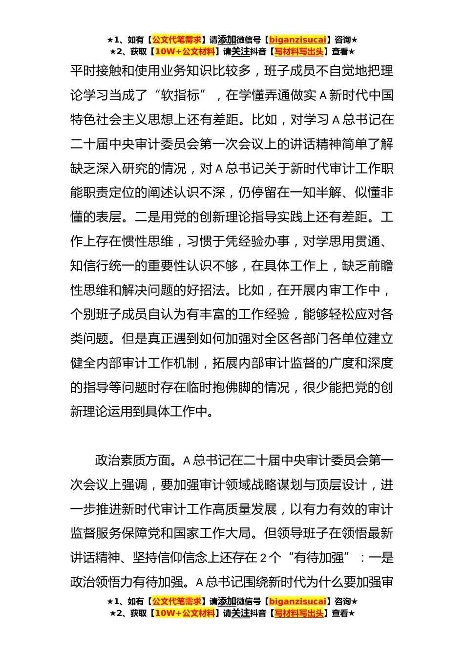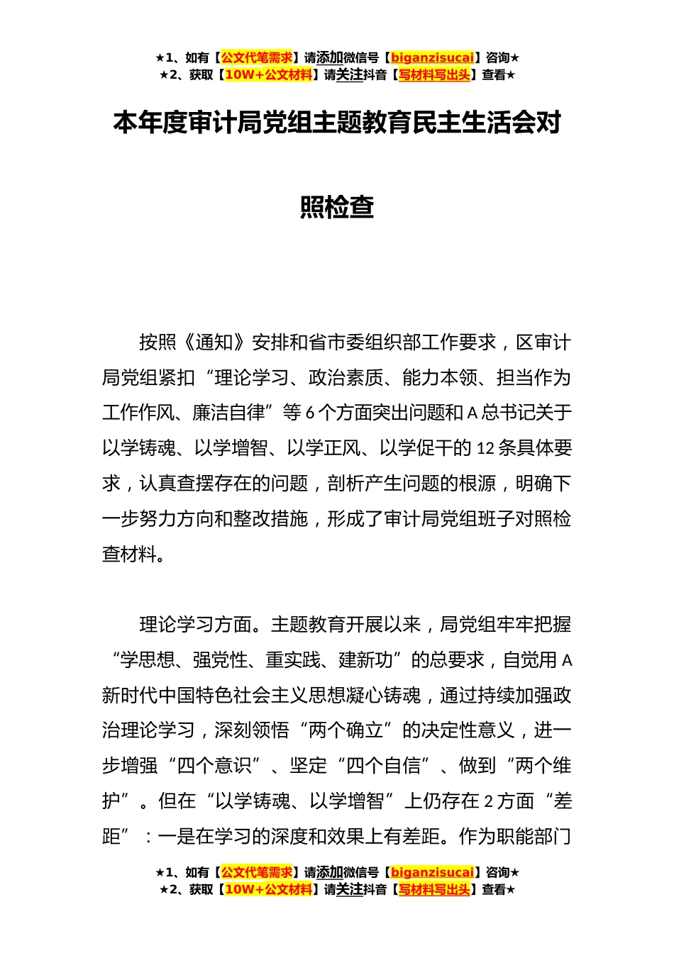 ★1、如有【公文代笔需求】请添加微信号【biganzisucai】咨询★★2、获取【10W+公文材料】请关注抖音【写材料写出头】查看★本年度审计局党组主题教育民主生活会对照检查按照《通知》安排和省市委组织部工作要求,区审计局党组紧扣“理论学习、政治素质、能力本领、担当作为工作作风、廉洁自律”等6个方面突出问题和A总书记关于以学铸魂、以学增智、以学正风、以学促干的12条具体要求,认真查摆存在的问题,剖析产生问题的根源,明确下一步努力方向和整改措施,形成了审计局党组班子对照检查材料。理论学习方面。主题教育开展以来,局党组牢牢把握“学思想、强党性、重实践、建新功”的总要求,自觉用A新时代中国特色社会主义思想凝心铸魂,通过持续加强政治理论学习,深刻领悟“两个确立”的决定性意义,进一步增...