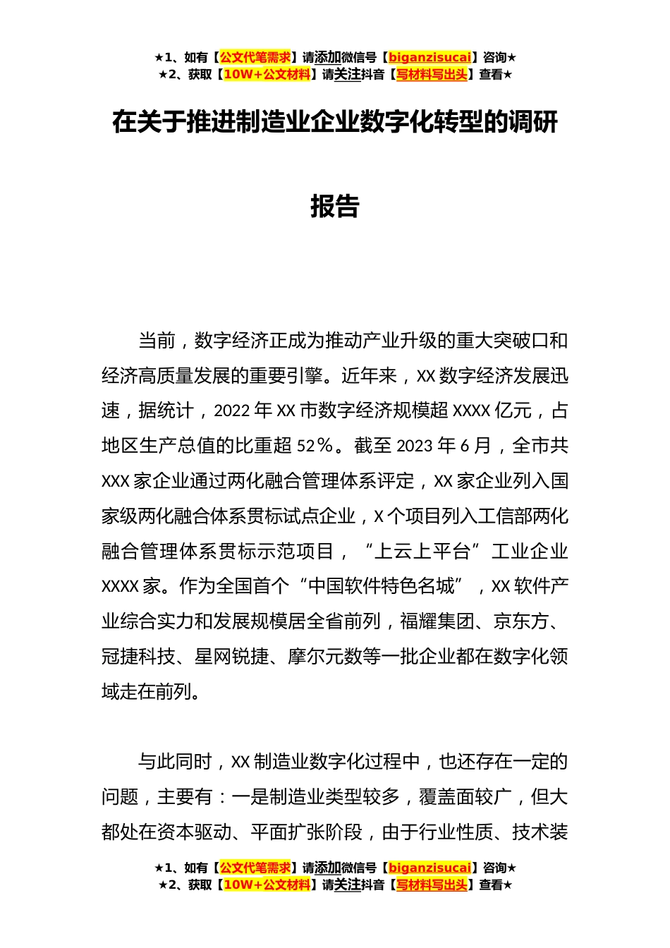 ★1、如有【公文代笔需求】请添加微信号【biganzisucai】咨询★★2、获取【10W+公文材料】请关注抖音【写材料写出头】查看★在关于推进制造业企业数字化转型的调研报告当前,数字经济正成为推动产业升级的重大突破口和经济高质量发展的重要引擎。近年来,XX数字经济发展迅速,据统计,2022年XX市数字经济规模超XXXX亿元,占地区生产总值的比重超52%。截至2023年6月,全市共XXX家企业通过两化融合管理体系评定,XX家企业列入国家级两化融合体系贯标试点企业,X个项目列入工信部两化融合管理体系贯标示范项目,“上云上平台”工业企业XXXX家。作为全国首个“中国软件特色名城”,XX软件产业综合实力和发展规模居全省前列,福耀集团、京东方、冠捷科技、星网锐捷、摩尔元数等一批企业都在数字化领域走在前列。与此同...
