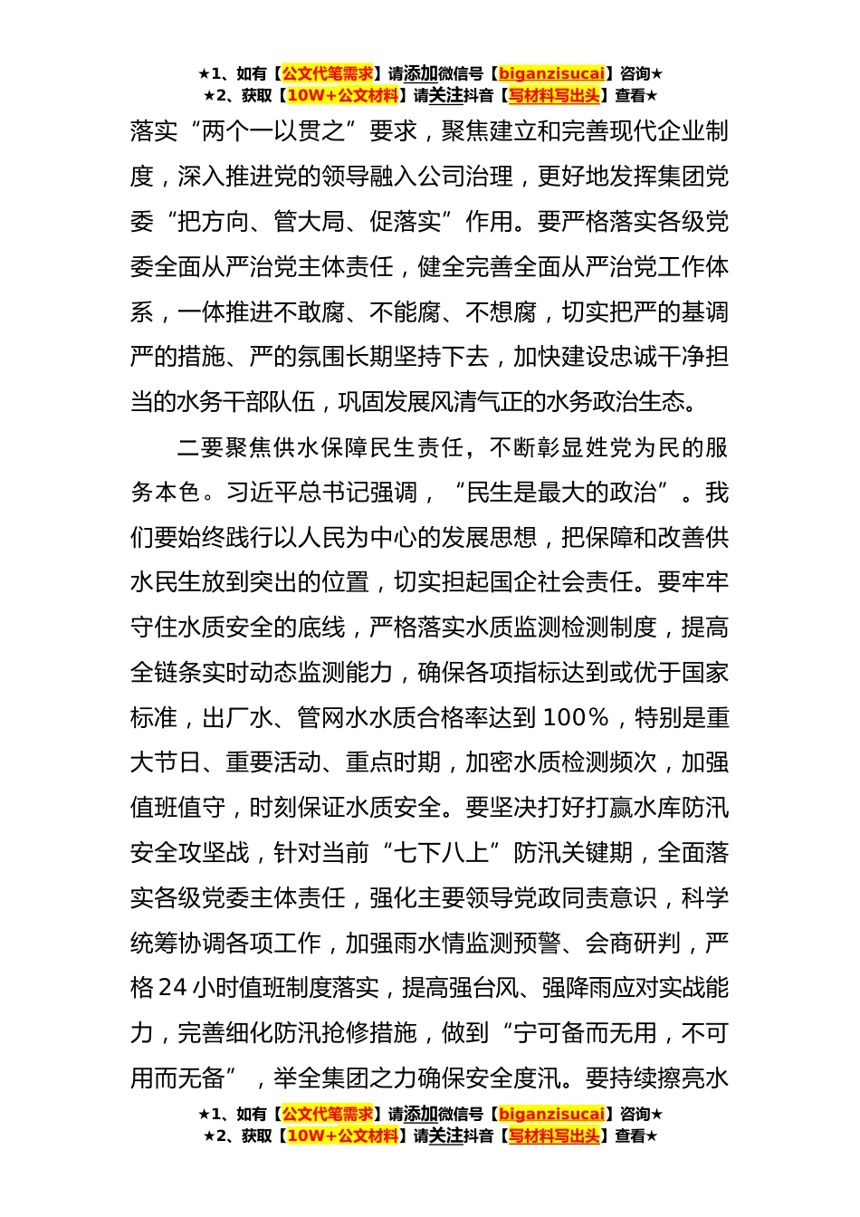 ★1、如有【公文代笔需求】请添加微信号【biganzisucai】咨询★★2、获取【10W+公文材料】请关注抖音【写材料写出头】查看★党委中心组学习研讨交流材料:坚决扛稳抓牢市属国企责任担当以高质量发展实践谱写中国式现代化XX篇章(1991字)习近平总书记强调,国有企业是中国特色社会主义的重要物质基础和政治基础,是中国特色社会主义经济的“顶梁柱”。XX集团作为市属大型国有企业,是助推社会经济高质量发展、推进中国式现代化XX实践的重要支撑。我们必须牢牢把握“学思想、强党性、重实践、建新功”总要求,把学习贯彻习近平新时代中国特色社会主义思想党的XX大精神与学习贯彻习近平总书记关于XX、XX重要讲话重要指示批示精神结合起来,做到学思用贯通,知信行统一,奋力走好具有水务特色的高质量发展道路,为XX加...