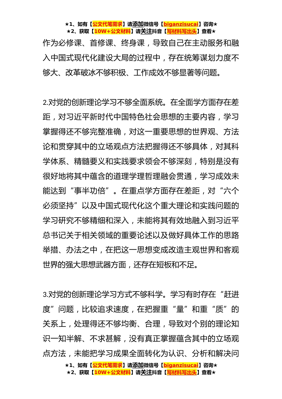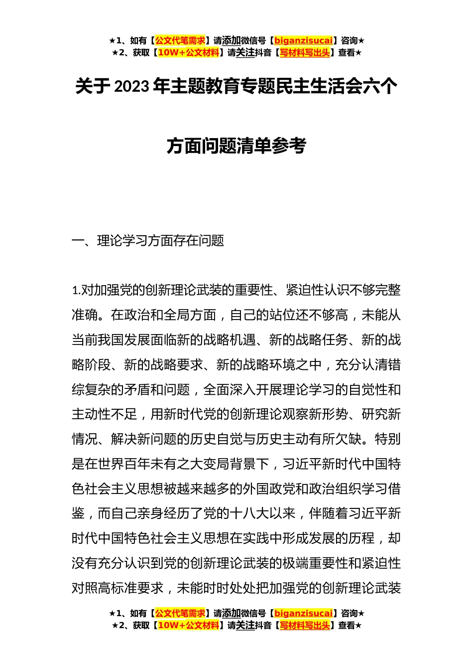 ★1、如有【公文代笔需求】请添加微信号【biganzisucai】咨询★★2、获取【10W+公文材料】请关注抖音【写材料写出头】查看★关于2023年主题教育专题民主生活会六个方面问题清单参考一、理论学习方面存在问题1.对加强党的创新理论武装的重要性、紧迫性认识不够完整准确。在政治和全局方面,自己的站位还不够高,未能从当前我国发展面临新的战略机遇、新的战略任务、新的战略阶段、新的战略要求、新的战略环境之中,充分认清错综复杂的矛盾和问题,全面深入开展理论学习的自觉性和主动性不足,用新时代党的创新理论观察新形势、研究新情况、解决新问题的历史自觉与历史主动有所欠缺。特别是在世界百年未有之大变局背景下,习近平新时代中国特色社会主义思想被越来越多的外国政党和政治组织学习借鉴,而自己亲身经历...