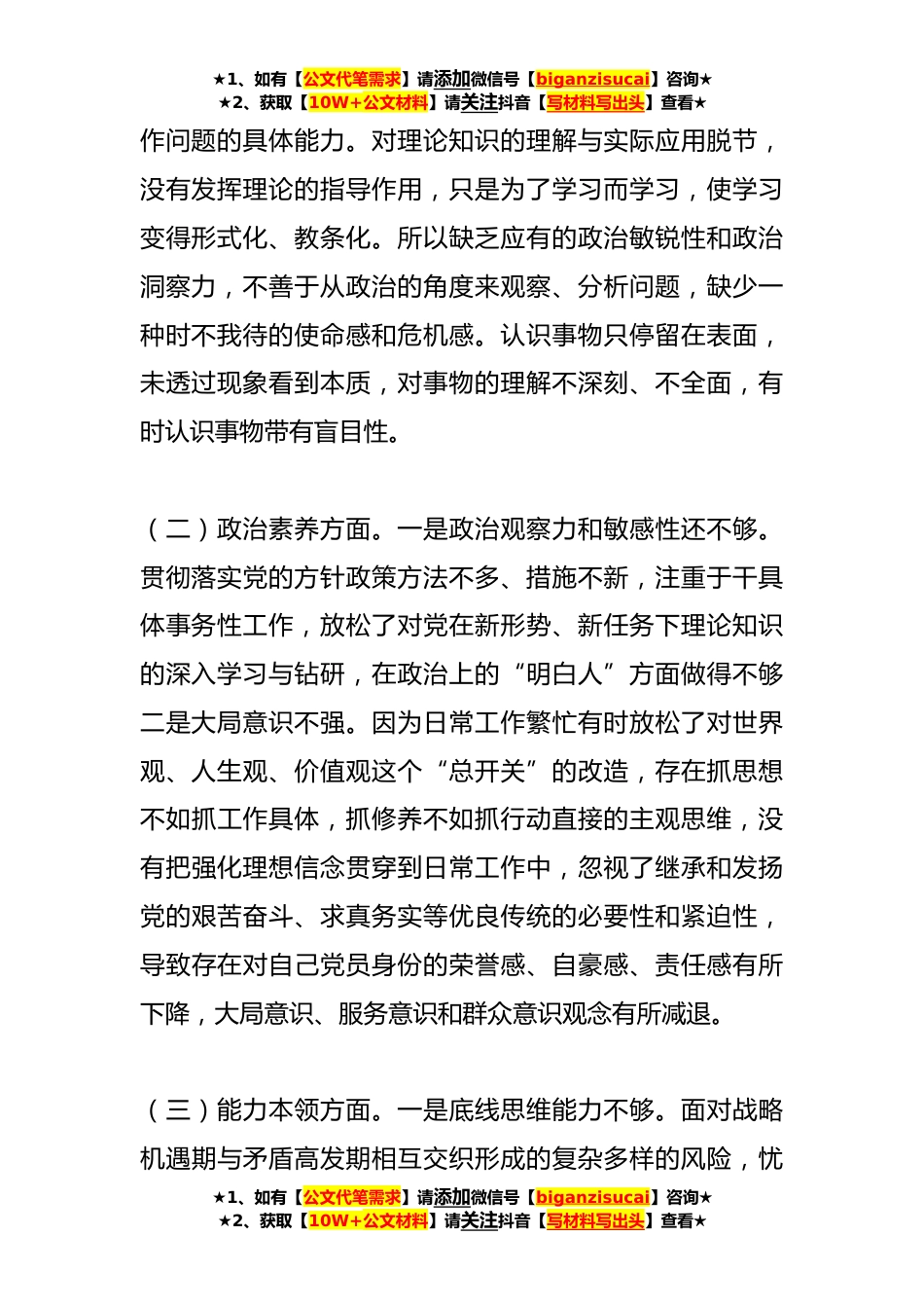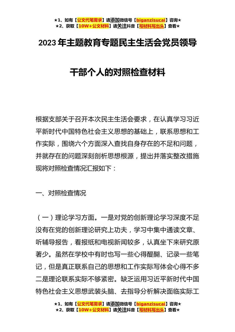 ★1、如有【公文代笔需求】请添加微信号【biganzisucai】咨询★★2、获取【10W+公文材料】请关注抖音【写材料写出头】查看★2023年主题教育专题民主生活会党员领导干部个人的对照检查材料根据支部关于召开本次民主生活会要求,在认真学习习近平新时代中国特色社会主义思想的基础上,联系思想和工作实际,围绕六个方面深入查找自身存在的不足和问题,并就存在的问题深刻剖析思想根源,提出并落实整改措施现将对照检查情况汇报如下:一、对照检查情况(一)理论学习方面。一是对党的创新理论学习深度不足没有在党的创新理论研究上功夫,学习中集中通读文章、听辅导报告,看报纸和电视新闻较多,认真坐下来研究原著少。虽然在学校中有时也写一些心得醍醐、记录一些笔记,但是真正联系自己的思想和工作实际写体会心得...