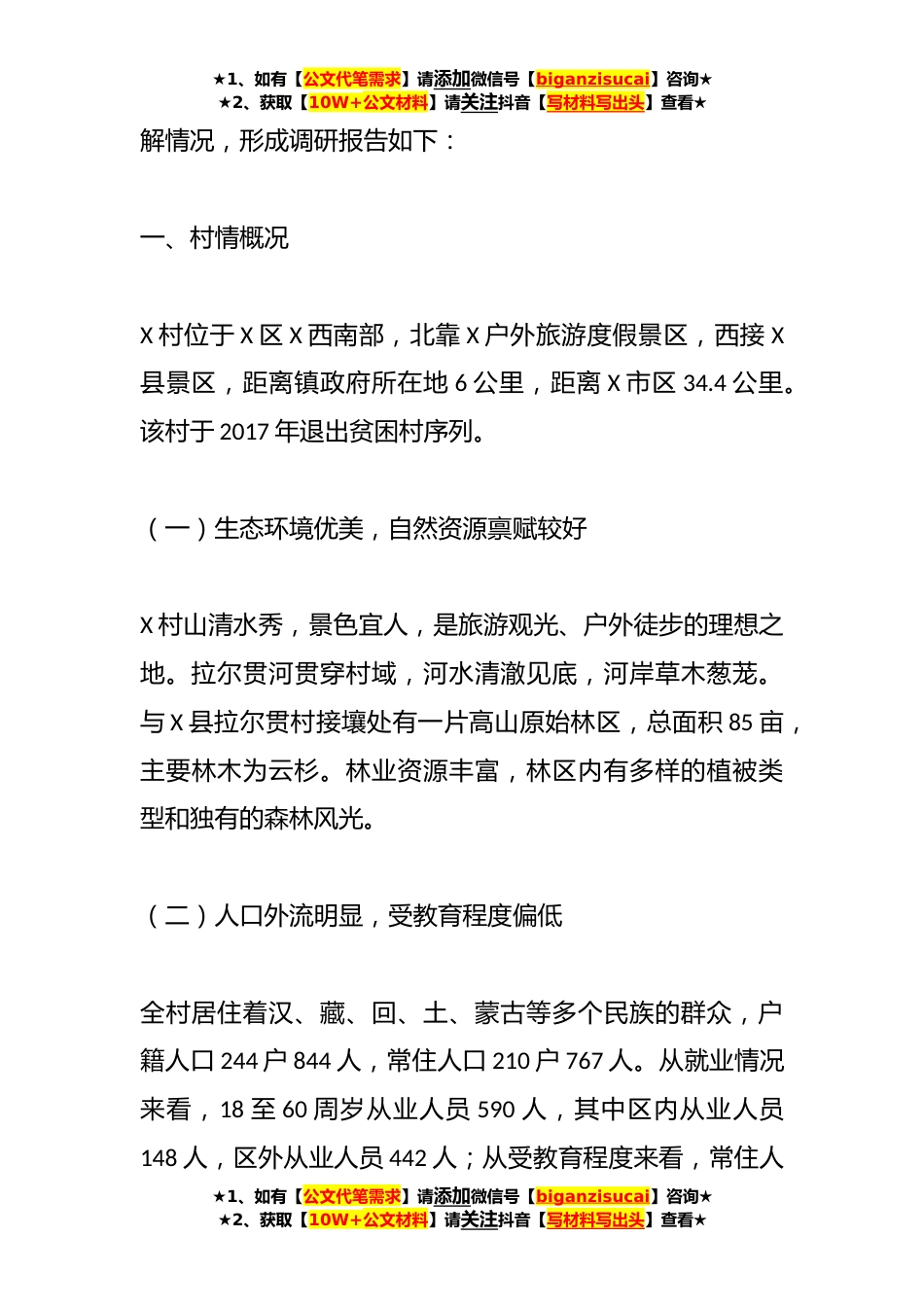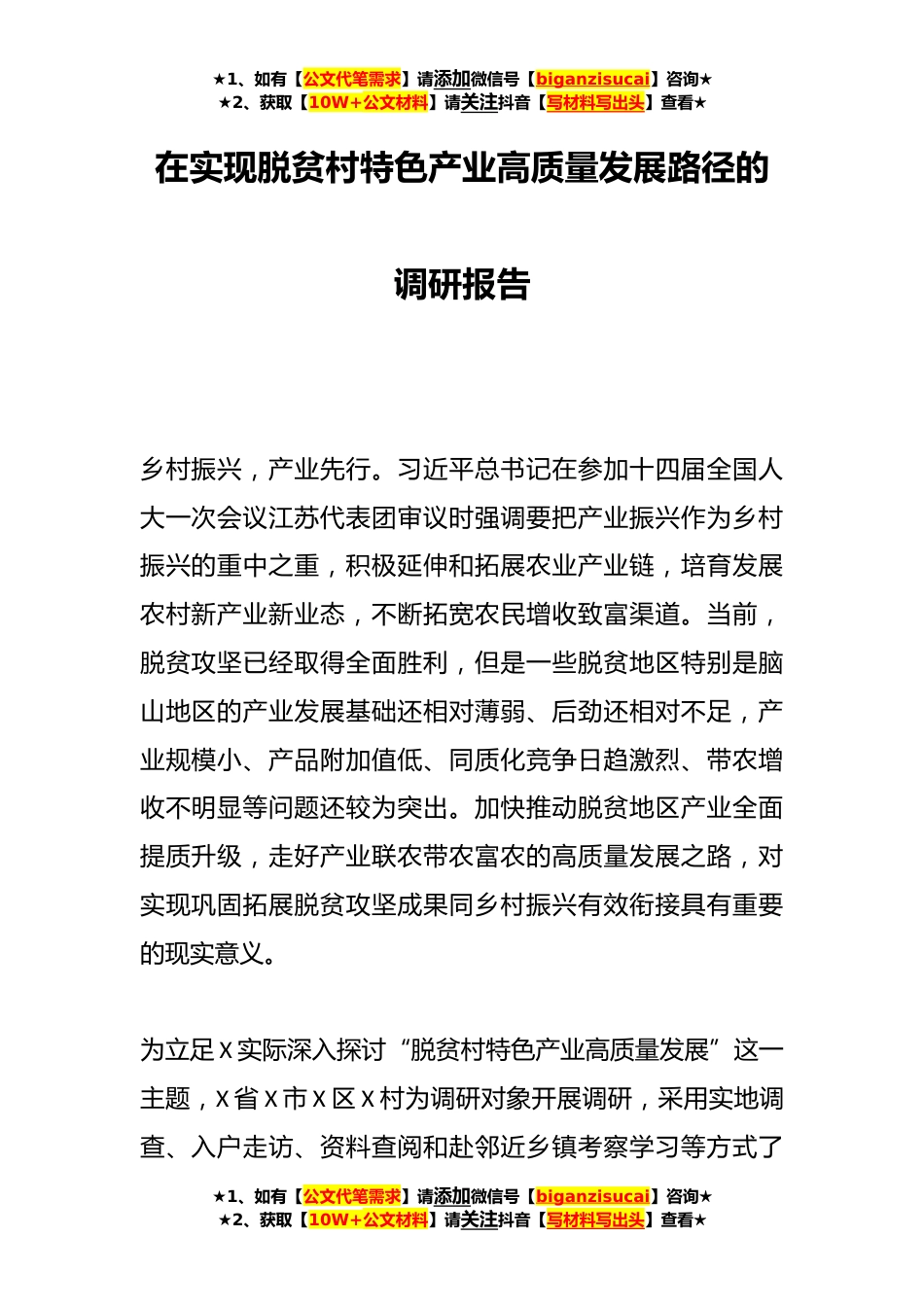 ★1、如有【公文代笔需求】请添加微信号【biganzisucai】咨询★★2、获取【10W+公文材料】请关注抖音【写材料写出头】查看★在实现脱贫村特色产业高质量发展路径的调研报告乡村振兴,产业先行。习近平总书记在参加十四届全国人大一次会议江苏代表团审议时强调要把产业振兴作为乡村振兴的重中之重,积极延伸和拓展农业产业链,培育发展农村新产业新业态,不断拓宽农民增收致富渠道。当前,脱贫攻坚已经取得全面胜利,但是一些脱贫地区特别是脑山地区的产业发展基础还相对薄弱、后劲还相对不足,产业规模小、产品附加值低、同质化竞争日趋激烈、带农增收不明显等问题还较为突出。加快推动脱贫地区产业全面提质升级,走好产业联农带农富农的高质量发展之路,对实现巩固拓展脱贫攻坚成果同乡村振兴有效衔接具有重要的...