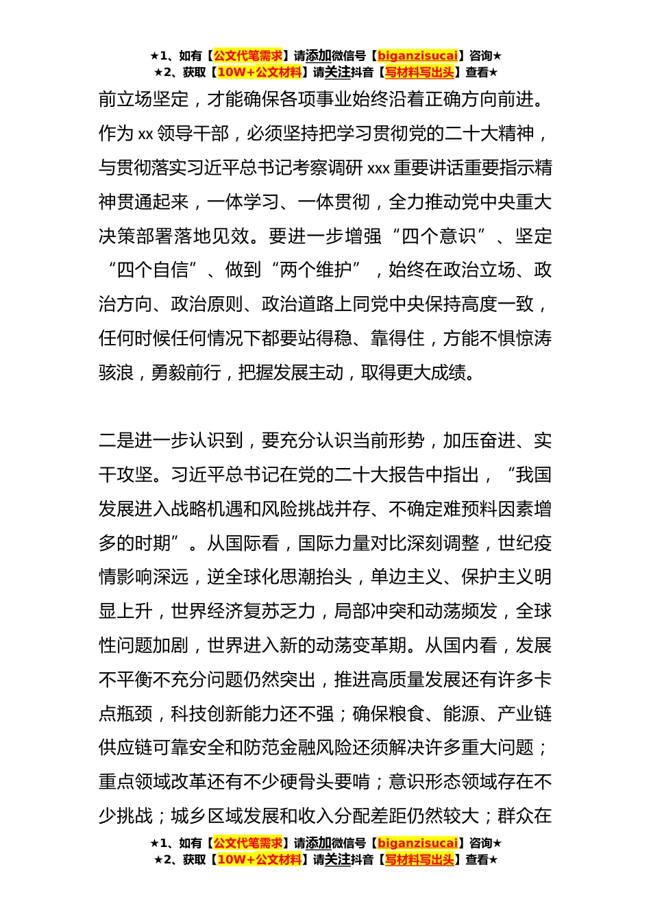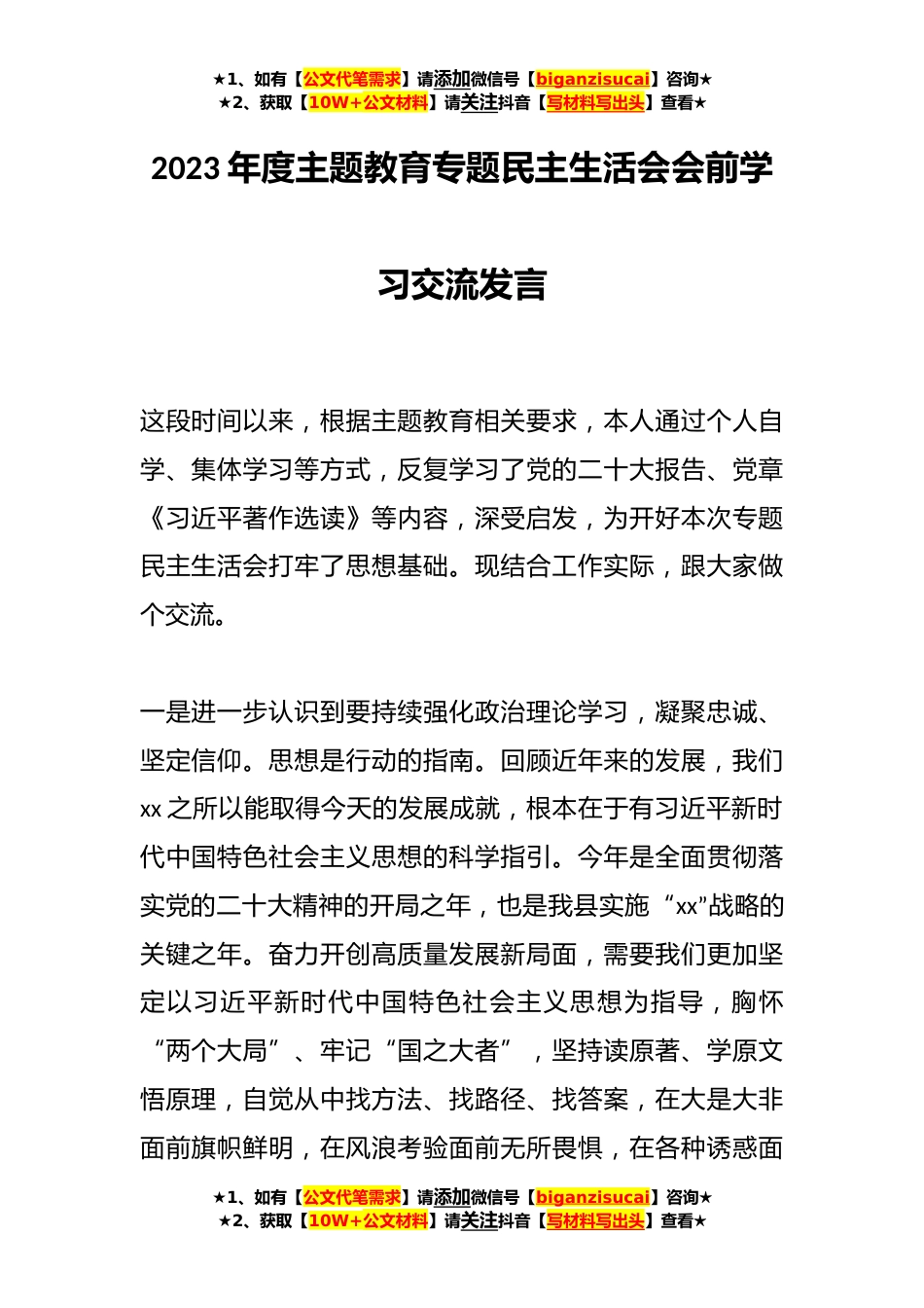 ★1、如有【公文代笔需求】请添加微信号【biganzisucai】咨询★★2、获取【10W+公文材料】请关注抖音【写材料写出头】查看★2023年度主题教育专题民主生活会会前学习交流发言这段时间以来,根据主题教育相关要求,本人通过个人自学、集体学习等方式,反复学习了党的二十大报告、党章《习近平著作选读》等内容,深受启发,为开好本次专题民主生活会打牢了思想基础。现结合工作实际,跟大家做个交流。一是进一步认识到要持续强化政治理论学习,凝聚忠诚、坚定信仰。思想是行动的指南。回顾近年来的发展,我们xx之所以能取得今天的发展成就,根本在于有习近平新时代中国特色社会主义思想的科学指引。今年是全面贯彻落实党的二十大精神的开局之年,也是我县实施“xx”战略的关键之年。奋力开创高质量发展新局面,需要...