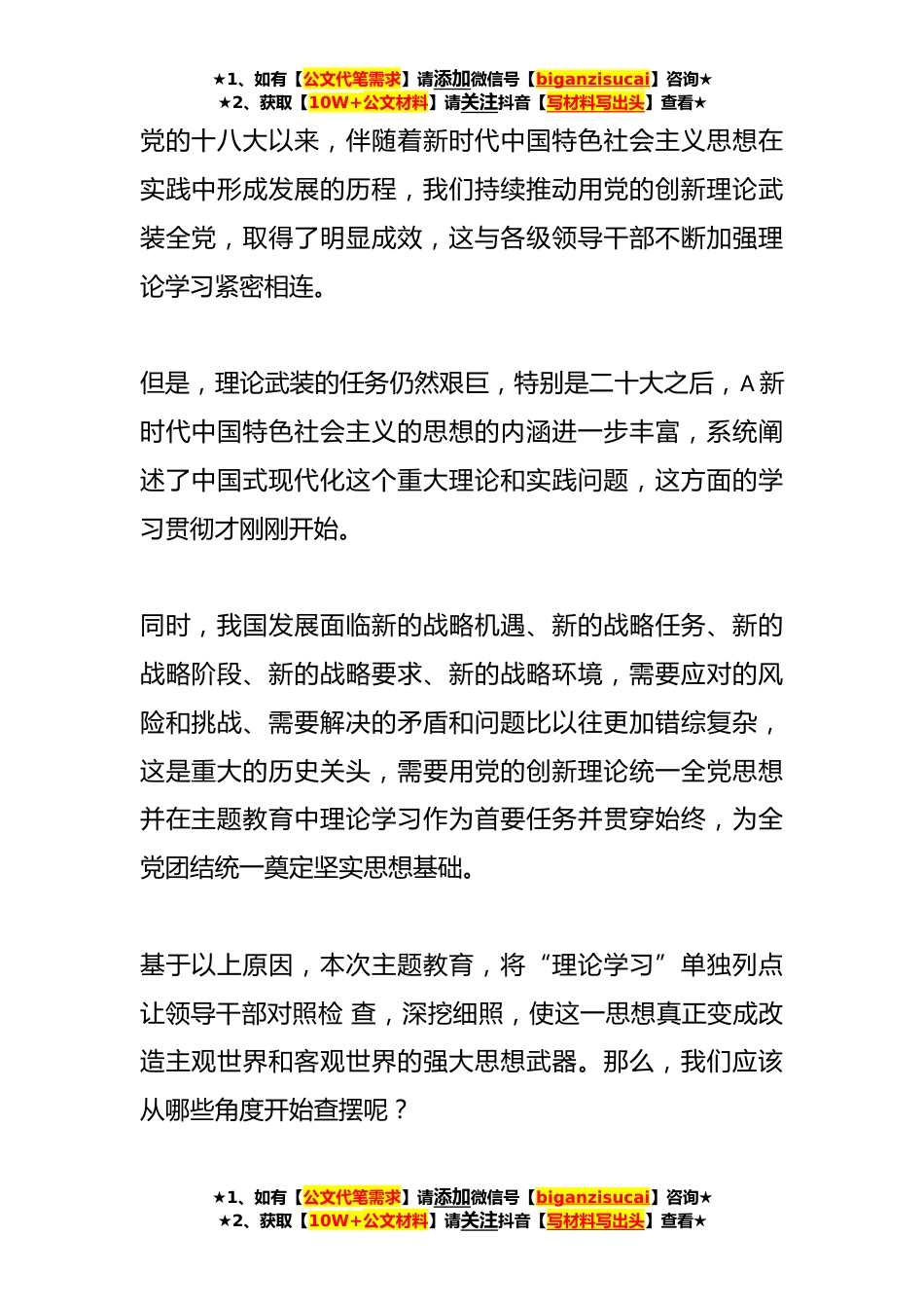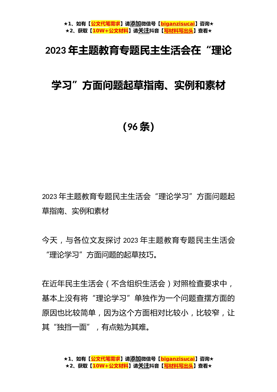 ★1、如有【公文代笔需求】请添加微信号【biganzisucai】咨询★★2、获取【10W+公文材料】请关注抖音【写材料写出头】查看★2023年主题教育专题民主生活会在“理论学习”方面问题起草指南、实例和素材(96条)2023年主题教育专题民主生活会“理论学习”方面问题起草指南、实例和素材今天,与各位文友探讨2023年主题教育专题民主生活会“理论学习”方面问题的起草技巧。在近年民主生活会(不含组织生活会)对照检查要求中,基本上没有将“理论学习”单独作为一个问题查摆方面的原因也比较简单,因为这个方面相对比较小,比较窄,让其“独挡一面”,有点勉为其难。★1、如有【公文代笔需求】请添加微信号【biganzisucai】咨询★★2、获取【10W+公文材料】请关注抖音【写材料写出头】查看★★1、如有【公文代笔需求】...