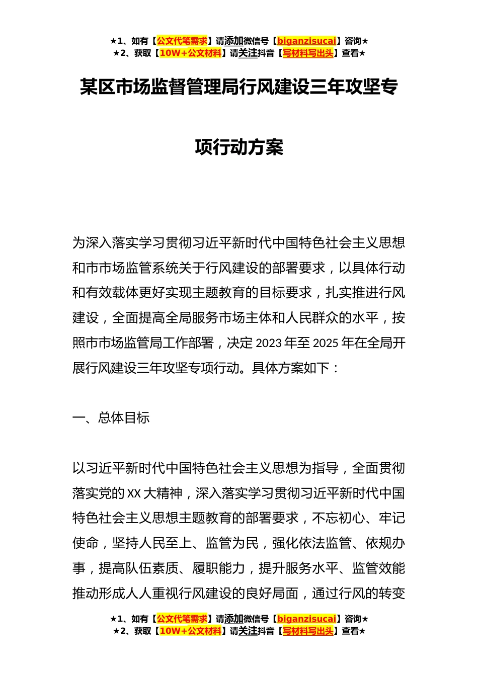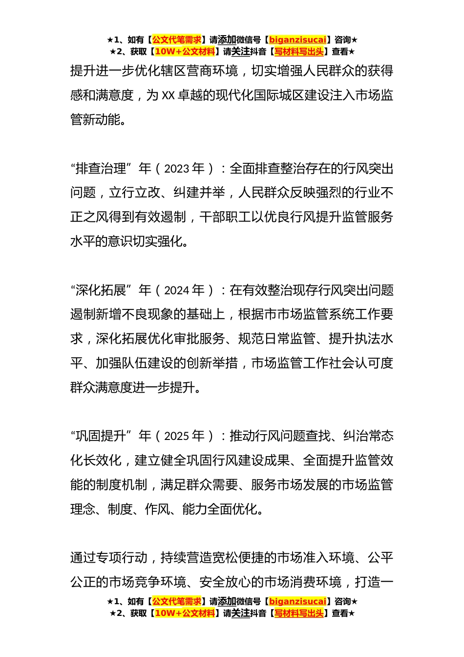 ★1、如有【公文代笔需求】请添加微信号【biganzisucai】咨询★★2、获取【10W+公文材料】请关注抖音【写材料写出头】查看★某区市场监督管理局行风建设三年攻坚专项行动方案为深入落实学习贯彻习近平新时代中国特色社会主义思想和市市场监管系统关于行风建设的部署要求,以具体行动和有效载体更好实现主题教育的目标要求,扎实推进行风建设,全面提高全局服务市场主体和人民群众的水平,按照市市场监管局工作部署,决定2023年至2025年在全局开展行风建设三年攻坚专项行动。具体方案如下:一、总体目标以习近平新时代中国特色社会主义思想为指导,全面贯彻落实党的XX大精神,深入落实学习贯彻习近平新时代中国特色社会主义思想主题教育的部署要求,不忘初心、牢记使命,坚持人民至上、监管为民,强化依法监管、依...