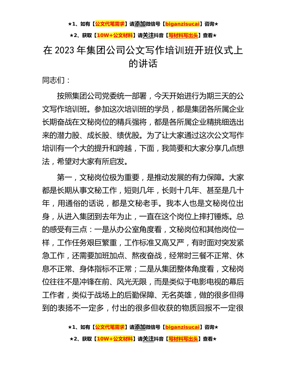 ★1、如有【公文代笔需求】请添加微信号【biganzisucai】咨询★★2、获取【10W+公文材料】请关注抖音【写材料写出头】查看★在2023年集团公司公文写作培训班开班仪式上的讲话同志们:按照集团公司党委统一部署,今天开始进行为期三天的公文写作培训班。参加这次培训班的学员,都是集团各所属企业长期奋战在文秘岗位的精兵强将,都是各所属企业精挑细选出来的潜力股、成长股、绩优股。为了让大家通过这次公文写作培训有一个大的提升和跨越,下面,我简要和大家分享几点想法,希望对大家有所启发。第一,文秘岗位极为重要,是推动发展的有力保障。大家都是长期从事文秘工作,短则几年,长则十几年、甚至是几十年,用通俗的话说,都是文秘老手。我本人也是文秘岗位出身,从进入集团到去年为止,一直在这个岗位上摔打...