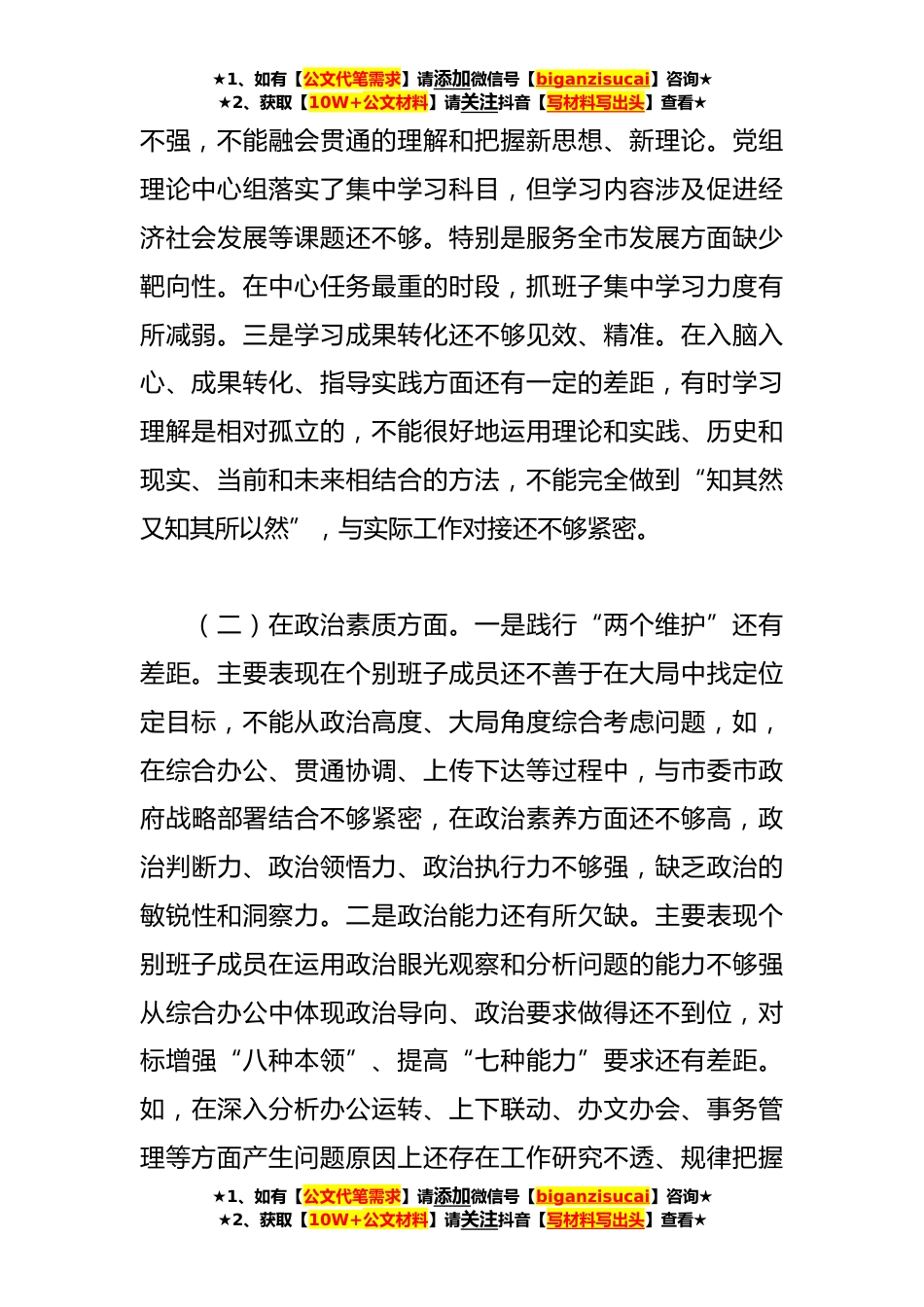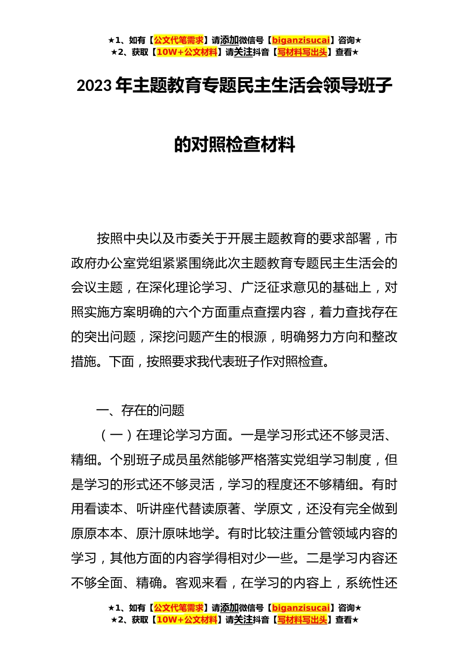 ★1、如有【公文代笔需求】请添加微信号【biganzisucai】咨询★★2、获取【10W+公文材料】请关注抖音【写材料写出头】查看★2023年主题教育专题民主生活会领导班子的对照检查材料按照中央以及市委关于开展主题教育的要求部署,市政府办公室党组紧紧围绕此次主题教育专题民主生活会的会议主题,在深化理论学习、广泛征求意见的基础上,对照实施方案明确的六个方面重点查摆内容,着力查找存在的突出问题,深挖问题产生的根源,明确努力方向和整改措施。下面,按照要求我代表班子作对照检查。一、存在的问题(一)在理论学习方面。一是学习形式还不够灵活、精细。个别班子成员虽然能够严格落实党组学习制度,但是学习的形式还不够灵活,学习的程度还不够精细。有时用看读本、听讲座代替读原著、学原文,还没有完全做...