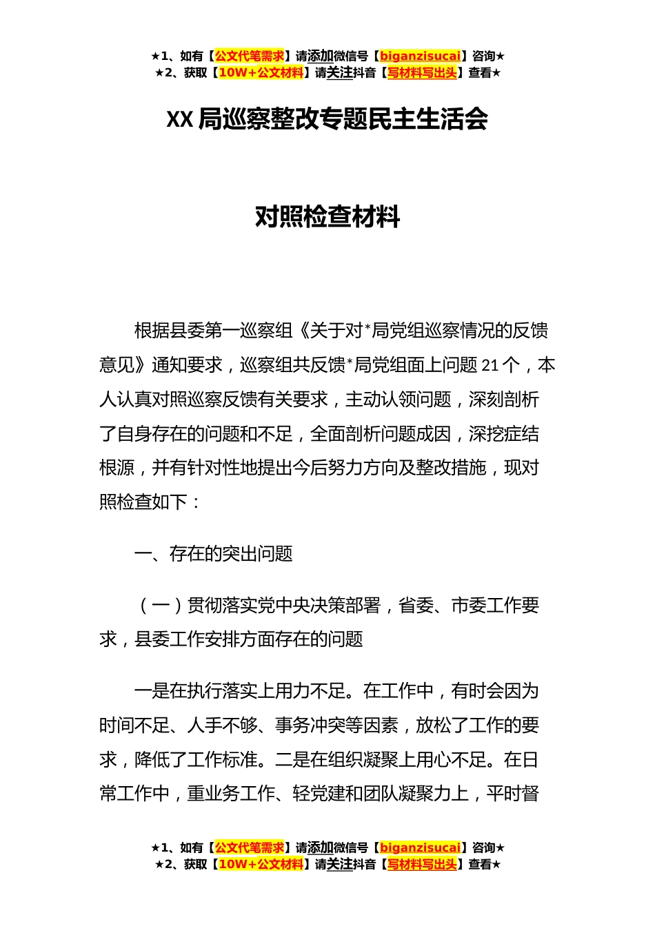 ★1、如有【公文代笔需求】请添加微信号【biganzisucai】咨询★★2、获取【10W+公文材料】请关注抖音【写材料写出头】查看★XX局巡察整改专题民主生活会对照检查材料根据县委第一巡察组《关于对*局党组巡察情况的反馈意见》通知要求,巡察组共反馈*局党组面上问题21个,本人认真对照巡察反馈有关要求,主动认领问题,深刻剖析了自身存在的问题和不足,全面剖析问题成因,深挖症结根源,并有针对性地提出今后努力方向及整改措施,现对照检查如下:一、存在的突出问题(一)贯彻落实党中央决策部署,省委、市委工作要求,县委工作安排方面存在的问题一是在执行落实上用力不足。在工作中,有时会因为时间不足、人手不够、事务冲突等因素,放松了工作的要求,降低了工作标准。二是在组织凝聚上用心不足。在日常工作中...