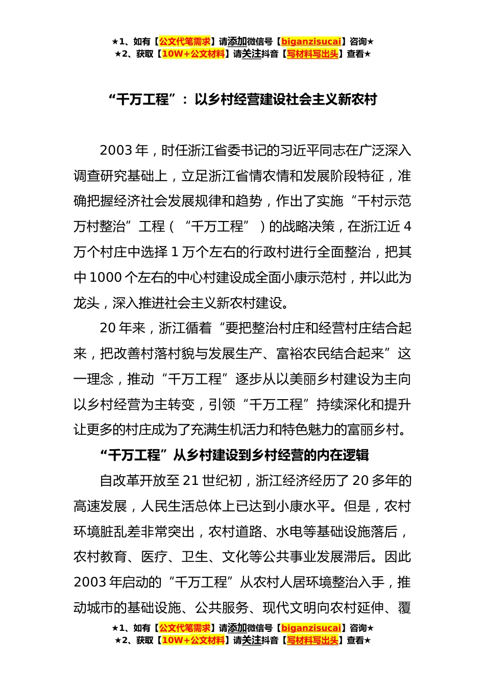 ★1、如有【公文代笔需求】请添加微信号【biganzisucai】咨询★★2、获取【10W+公文材料】请关注抖音【写材料写出头】查看★“千万工程”:以乡村经营建设社会主义新农村2003年,时任浙江省委书记的习近平同志在广泛深入调查研究基础上,立足浙江省情农情和发展阶段特征,准确把握经济社会发展规律和趋势,作出了实施“千村示范万村整治”工程(“千万工程”)的战略决策,在浙江近4万个村庄中选择1万个左右的行政村进行全面整治,把其中1000个左右的中心村建设成全面小康示范村,并以此为龙头,深入推进社会主义新农村建设。20年来,浙江循着“要把整治村庄和经营村庄结合起来,把改善村落村貌与发展生产、富裕农民结合起来”这一理念,推动“千万工程”逐步从以美丽乡村建设为主向以乡村经营为主转变,引领“千...