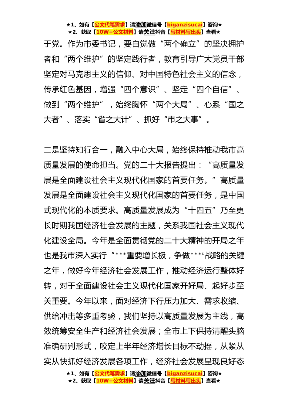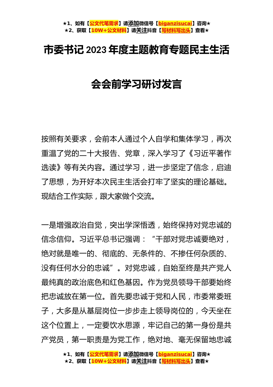★1、如有【公文代笔需求】请添加微信号【biganzisucai】咨询★★2、获取【10W+公文材料】请关注抖音【写材料写出头】查看★市委书记2023年度主题教育专题民主生活会会前学习研讨发言按照有关要求,会前本人通过个人自学和集体学习,再次重温了党的二十大报告、党章,深入学习了《习近平著作选读》等有关内容。通过学习,进一步坚定了信念,启迪了思想,为开好本次民主生活会打牢了坚实的理论基础。现结合工作实际,跟大家做个交流。一是增强政治自觉,突出学深悟透,始终保持对党忠诚的信念信仰。习近平总书记强调:“干部对党忠诚要绝对,绝对就是唯一的、彻底的、无条件的、不掺任何杂质的、没有任何水分的忠诚”。对党忠诚,自始至终是共产党人最纯真的政治底色和红色基因。作为党员领导干部要始终把忠诚放在...