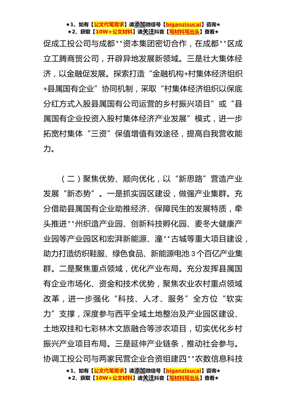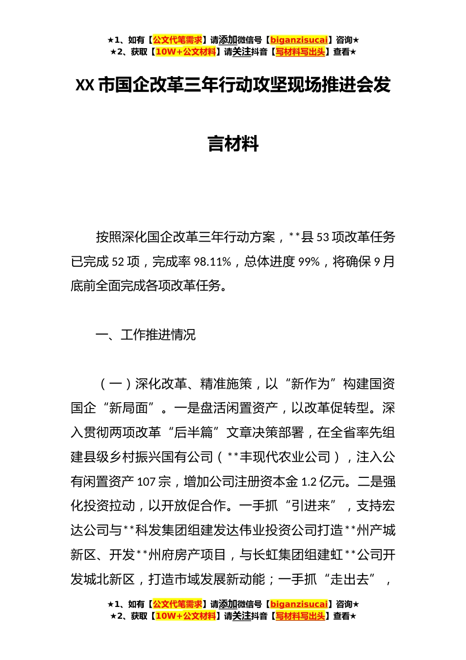 ★1、如有【公文代笔需求】请添加微信号【biganzisucai】咨询★★2、获取【10W+公文材料】请关注抖音【写材料写出头】查看★XX市国企改革三年行动攻坚现场推进会发言材料按照深化国企改革三年行动方案,**县53项改革任务已完成52项,完成率98.11%,总体进度99%,将确保9月底前全面完成各项改革任务。一、工作推进情况(一)深化改革、精准施策,以“新作为”构建国资国企“新局面”。一是盘活闲置资产,以改革促转型。深入贯彻两项改革“后半篇”文章决策部署,在全省率先组建县级乡村振兴国有公司(**丰现代农业公司),注入公有闲置资产107宗,增加公司注册资本金1.2亿元。二是强化投资拉动,以开放促合作。一手抓“引进来”,支持宏达公司与**科发集团组建发达伟业投资公司打造**州产城新区、开发**州府房产项...