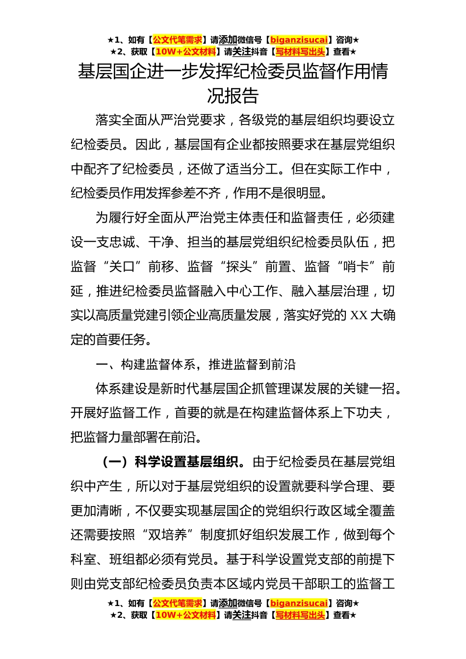 ★1、如有【公文代笔需求】请添加微信号【biganzisucai】咨询★★2、获取【10W+公文材料】请关注抖音【写材料写出头】查看★基层国企进一步发挥纪检委员监督作用情况报告落实全面从严治党要求,各级党的基层组织均要设立纪检委员。因此,基层国有企业都按照要求在基层党组织中配齐了纪检委员,还做了适当分工。但在实际工作中,纪检委员作用发挥参差不齐,作用不是很明显。为履行好全面从严治党主体责任和监督责任,必须建设一支忠诚、干净、担当的基层党组织纪检委员队伍,把监督“关口”前移、监督“探头”前置、监督“哨卡”前延,推进纪检委员监督融入中心工作、融入基层治理,切实以高质量党建引领企业高质量发展,落实好党的XX大确定的首要任务。一、构建监督体系,推进监督到前沿体系建设是新时代基层国企...
