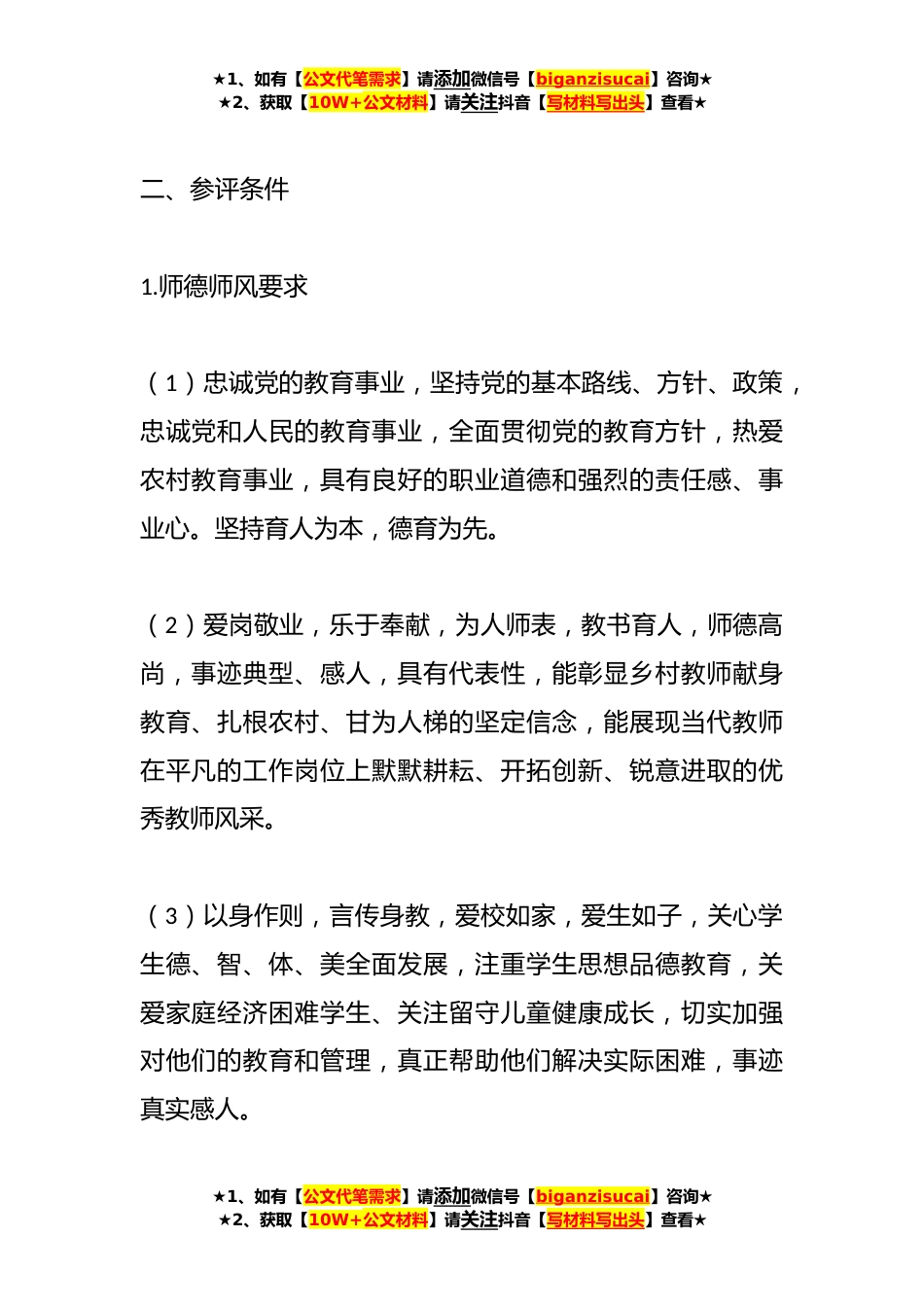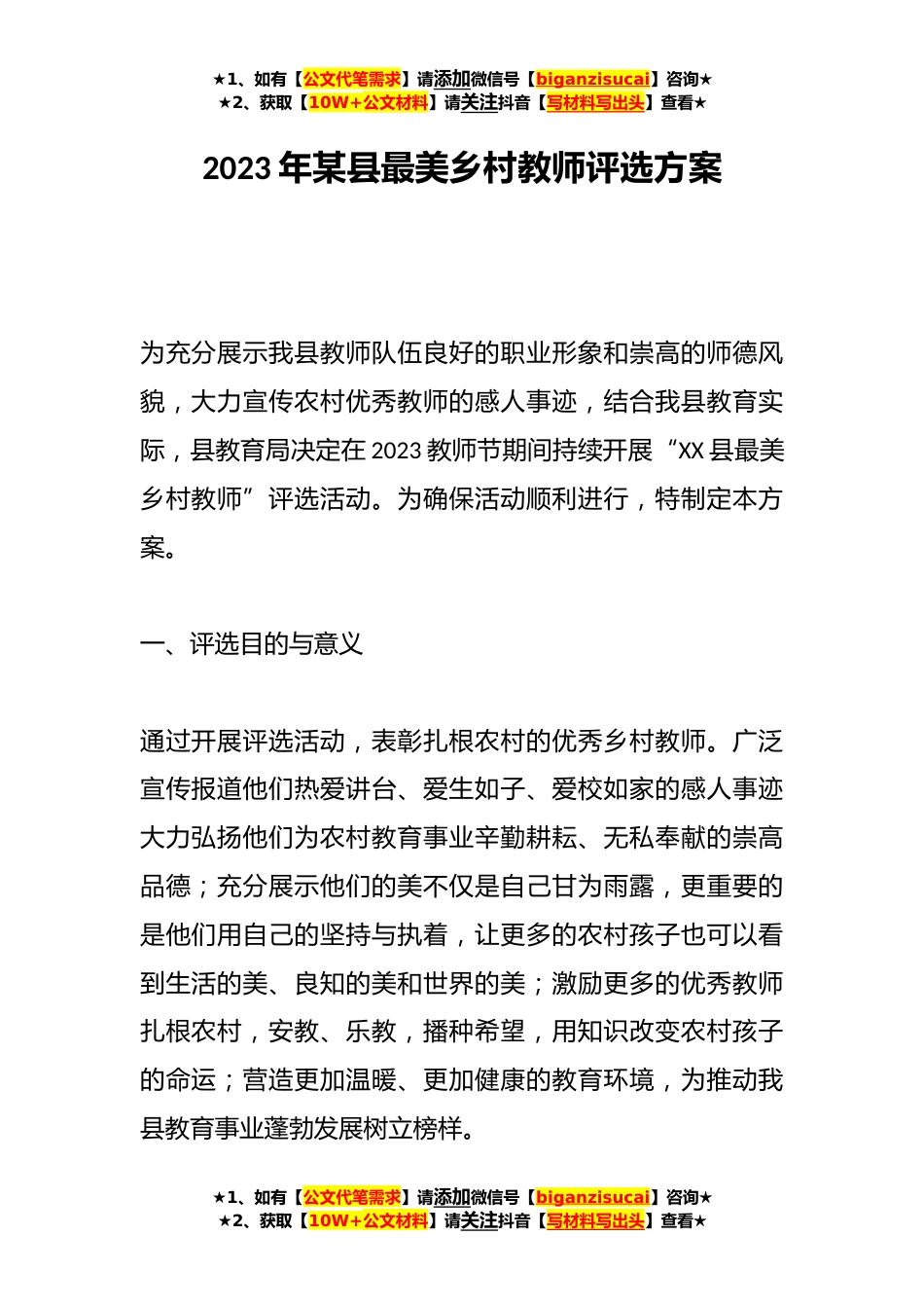 ★1、如有【公文代笔需求】请添加微信号【biganzisucai】咨询★★2、获取【10W+公文材料】请关注抖音【写材料写出头】查看★2023年某县最美乡村教师评选方案为充分展示我县教师队伍良好的职业形象和崇高的师德风貌,大力宣传农村优秀教师的感人事迹,结合我县教育实际,县教育局决定在2023教师节期间持续开展“XX县最美乡村教师”评选活动。为确保活动顺利进行,特制定本方案。一、评选目的与意义通过开展评选活动,表彰扎根农村的优秀乡村教师。广泛宣传报道他们热爱讲台、爱生如子、爱校如家的感人事迹大力弘扬他们为农村教育事业辛勤耕耘、无私奉献的崇高品德;充分展示他们的美不仅是自己甘为雨露,更重要的是他们用自己的坚持与执着,让更多的农村孩子也可以看到生活的美、良知的美和世界的美;激励更多的优...