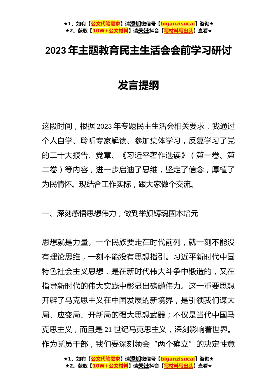 ★1、如有【公文代笔需求】请添加微信号【biganzisucai】咨询★★2、获取【10W+公文材料】请关注抖音【写材料写出头】查看★2023年主题教育民主生活会会前学习研讨发言提纲这段时间,根据2023年专题民主生活会相关要求,我通过个人自学、聆听专家解读、参加集体学习,反复学习了党的二十大报告、党章、《习近平著作选读》(第一卷、第二卷)等内容,进一步启迪了思维,坚定了信念,厚植了为民情怀。现结合工作实际,跟大家做个交流。一、深刻感悟思想伟力,做到举旗铸魂固本培元思想就是力量。一个民族要走在时代前列,就一刻不能没有理论思维,一刻不能没有思想指引。习近平新时代中国特色社会主义思想,是在新时代伟大斗争中锻造的,又在指导新时代的伟大实践中彰显出磅礴伟力。这一重要思想开辟了马克思主义在...