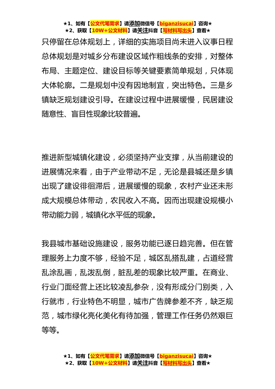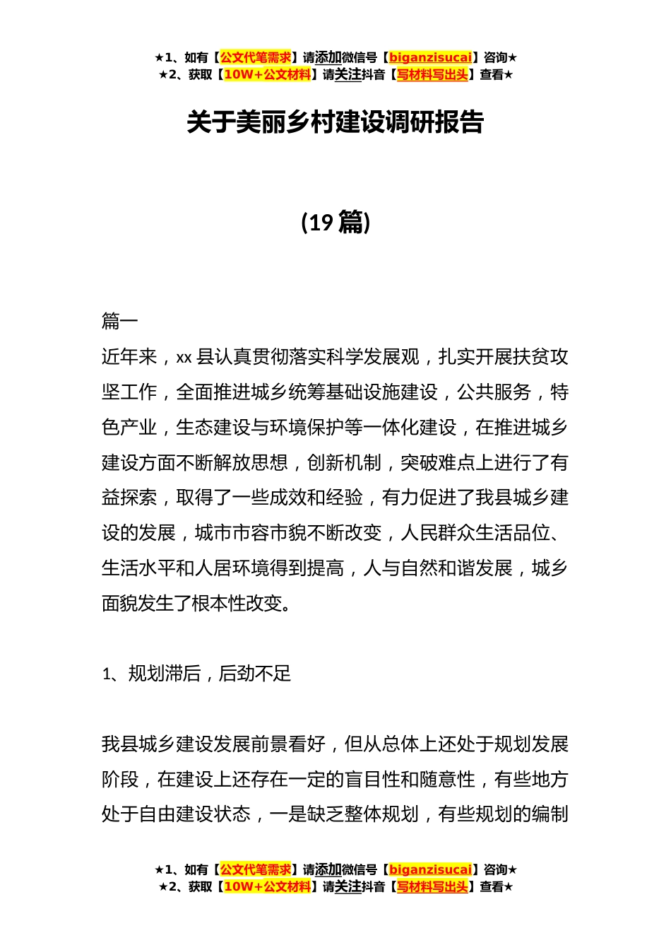 ★1、如有【公文代笔需求】请添加微信号【biganzisucai】咨询★★2、获取【10W+公文材料】请关注抖音【写材料写出头】查看★关于美丽乡村建设调研报告(19篇)篇一近年来,xx县认真贯彻落实科学发展观,扎实开展扶贫攻坚工作,全面推进城乡统筹基础设施建设,公共服务,特色产业,生态建设与环境保护等一体化建设,在推进城乡建设方面不断解放思想,创新机制,突破难点上进行了有益探索,取得了一些成效和经验,有力促进了我县城乡建设的发展,城市市容市貌不断改变,人民群众生活品位、生活水平和人居环境得到提高,人与自然和谐发展,城乡面貌发生了根本性改变。1、规划滞后,后劲不足我县城乡建设发展前景看好,但从总体上还处于规划发展阶段,在建设上还存在一定的盲目性和随意性,有些地方处于自由建设状态,一...