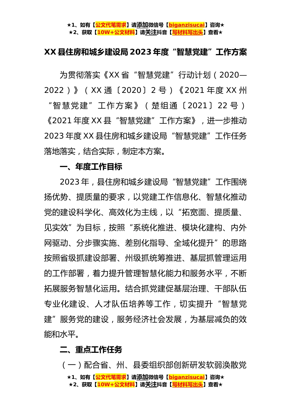 ★1、如有【公文代笔需求】请添加微信号【biganzisucai】咨询★★2、获取【10W+公文材料】请关注抖音【写材料写出头】查看★XX县住房和城乡建设局2023年度“智慧党建”工作方案为贯彻落实《XX省“智慧党建”行动计划(2020—2022)》(XX通〔2020〕2号)《2021年度XX州“智慧党建”工作方案》(楚组通〔2021〕22号)《2021年度XX县“智慧党建”工作方案》,进一步推动2023年度XX县住房和城乡建设局“智慧党建”工作任务落地落实,结合实际,制定本方案。一、年度工作目标2023年,县住房和城乡建设局“智慧党建”工作围绕扬优势、提质量的要求,以党建工作信息化、智慧化推动党的建设科学化、高效化为主线,以“拓宽面、提质量、见实效”为目标,按照“系统化推进、模块化建构、内外网驱动、分步骤实施、差别化指导...