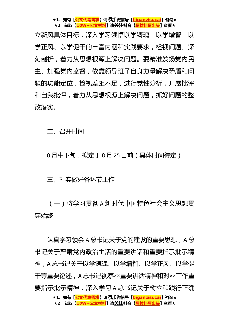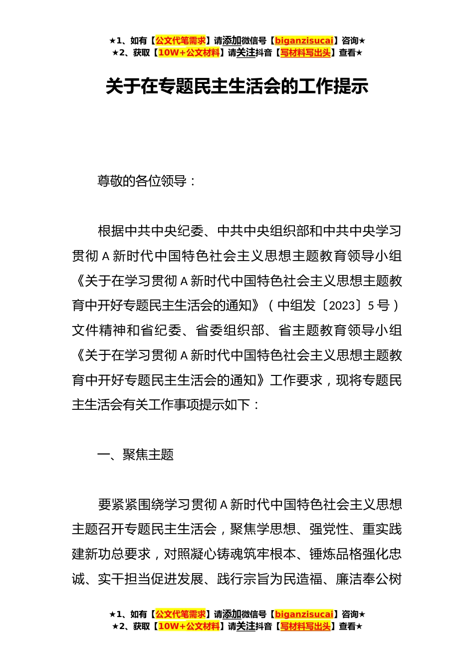 ★1、如有【公文代笔需求】请添加微信号【biganzisucai】咨询★★2、获取【10W+公文材料】请关注抖音【写材料写出头】查看★关于在专题民主生活会的工作提示尊敬的各位领导:根据中共中央纪委、中共中央组织部和中共中央学习贯彻A新时代中国特色社会主义思想主题教育领导小组《关于在学习贯彻A新时代中国特色社会主义思想主题教育中开好专题民主生活会的通知》(中组发〔2023〕5号)文件精神和省纪委、省委组织部、省主题教育领导小组《关于在学习贯彻A新时代中国特色社会主义思想主题教育中开好专题民主生活会的通知》工作要求,现将专题民主生活会有关工作事项提示如下:一、聚焦主题要紧紧围绕学习贯彻A新时代中国特色社会主义思想主题召开专题民主生活会,聚焦学思想、强党性、重实践建新功总要求,对照凝心铸...