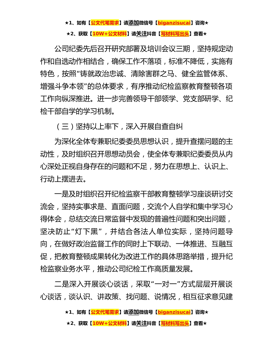 ★1、如有【公文代笔需求】请添加微信号【biganzisucai】咨询★★2、获取【10W+公文材料】请关注抖音【写材料写出头】查看★国企纪检监察干部教育整顿开展情况总结报告纪检监察干部队伍教育整顿工作开展以来,集团公司党组高度重视,结合主题教育活动,坚持以理论学习为基础不断提高思想认识,以政治教育、党性教育为抓手,多措并举不断夯实教育整顿的思想基础,努力把教育整顿工作转化为推动纪检监察工作和国有企业高质量发展的强大动力。截至目前,公司未发现纪检监察干部违规违纪违法行为。现将工作开展情况汇报如下:一、开展的主要工作(一)坚持以上率下,压实各级工作责任公司始终把开展纪检监察干部队伍教育整顿工作作为一项重大政治任务,把党的领导贯穿到教育整顿全过程,通过公司党委会、理论中心组学...