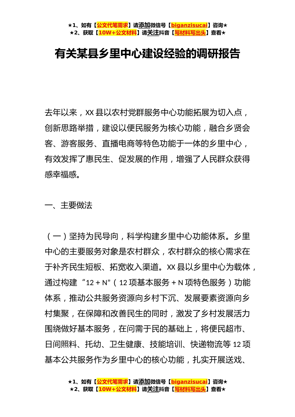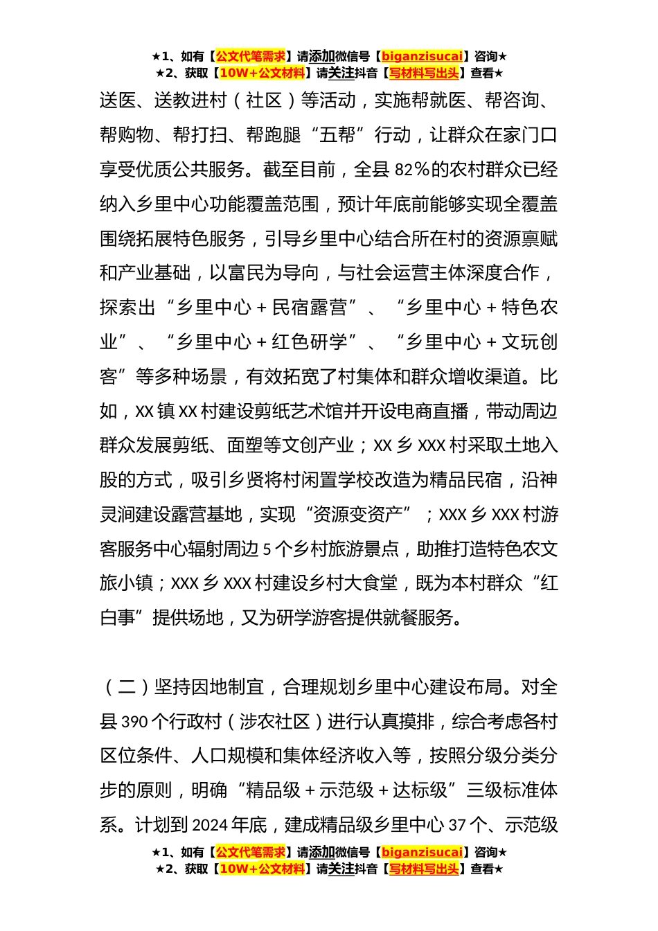 ★1、如有【公文代笔需求】请添加微信号【biganzisucai】咨询★★2、获取【10W+公文材料】请关注抖音【写材料写出头】查看★有关某县乡里中心建设经验的调研报告去年以来,XX县以农村党群服务中心功能拓展为切入点,创新思路举措,建设以便民服务为核心功能,融合乡贤会客、游客服务、直播电商等特色功能于一体的乡里中心,有效发挥了惠民生、促发展的作用,增强了人民群众获得感幸福感。一、主要做法(一)坚持为民导向,科学构建乡里中心功能体系。乡里中心的主要服务对象是农村群众,农村群众的核心需求在于补齐民生短板、拓宽收入渠道。XX县以乡里中心为载体,通过构建“12+N”(12项基本服务+N项特色服务)功能体系,推动公共服务资源向乡村下沉、发展要素资源向乡村集聚,在保障和改善民生的同时,激发了...