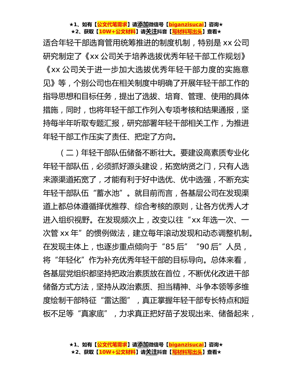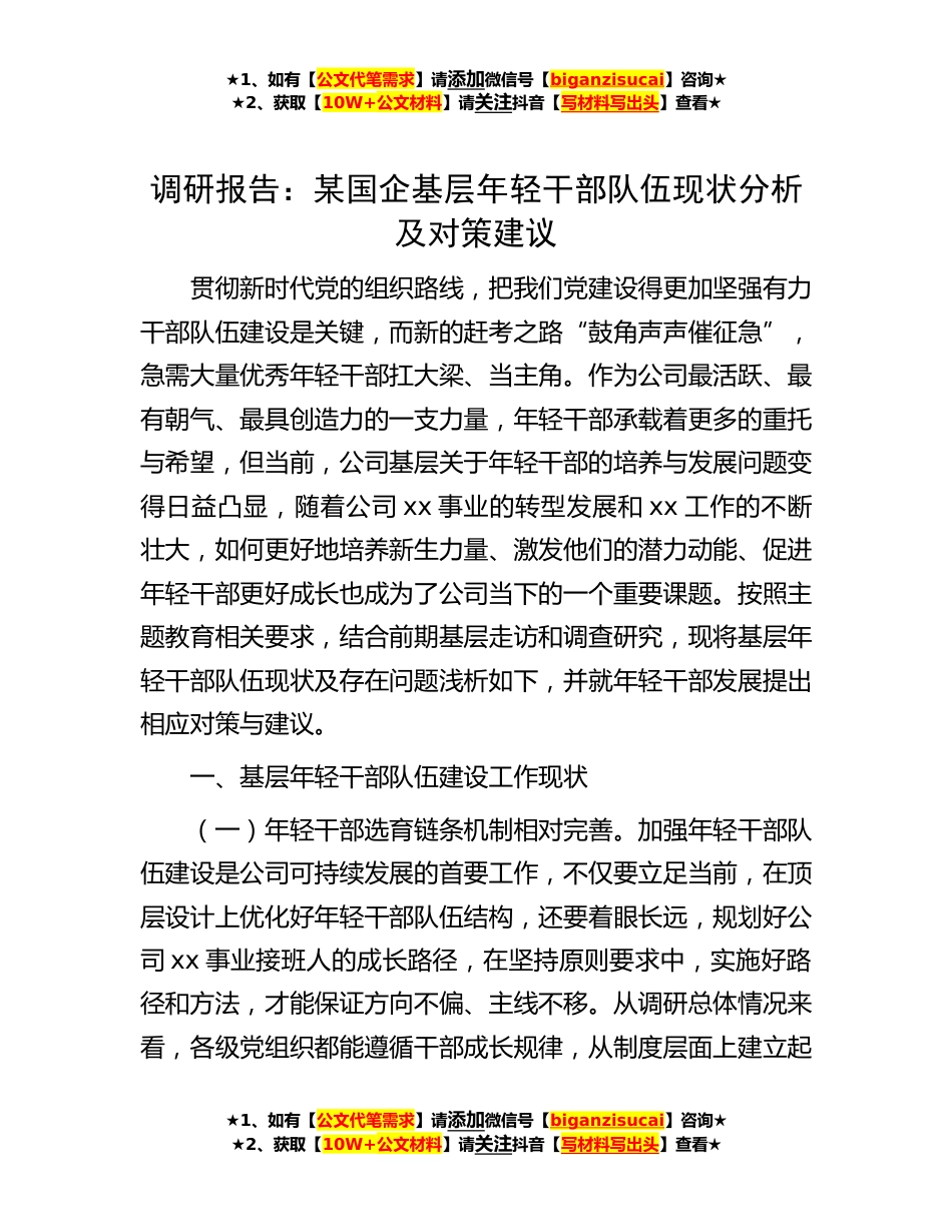 ★1、如有【公文代笔需求】请添加微信号【biganzisucai】咨询★★2、获取【10W+公文材料】请关注抖音【写材料写出头】查看★调研报告:某国企基层年轻干部队伍现状分析及对策建议贯彻新时代党的组织路线,把我们党建设得更加坚强有力干部队伍建设是关键,而新的赶考之路“鼓角声声催征急”,急需大量优秀年轻干部扛大梁、当主角。作为公司最活跃、最有朝气、最具创造力的一支力量,年轻干部承载着更多的重托与希望,但当前,公司基层关于年轻干部的培养与发展问题变得日益凸显,随着公司xx事业的转型发展和xx工作的不断壮大,如何更好地培养新生力量、激发他们的潜力动能、促进年轻干部更好成长也成为了公司当下的一个重要课题。按照主题教育相关要求,结合前期基层走访和调查研究,现将基层年轻干部队伍现状及存...