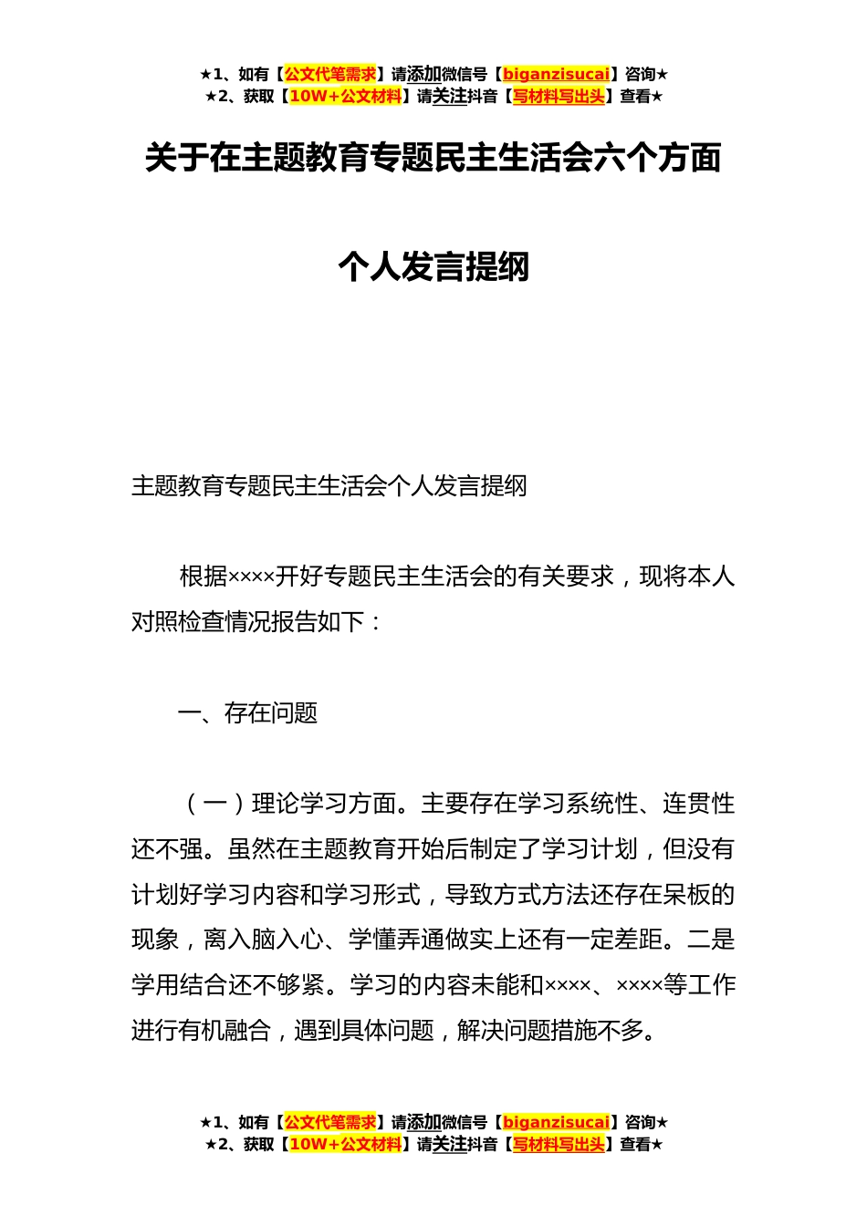 ★1、如有【公文代笔需求】请添加微信号【biganzisucai】咨询★★2、获取【10W+公文材料】请关注抖音【写材料写出头】查看★关于在主题教育专题民主生活会六个方面个人发言提纲主题教育专题民主生活会个人发言提纲根据××××开好专题民主生活会的有关要求,现将本人对照检查情况报告如下:一、存在问题(一)理论学习方面。主要存在学习系统性、连贯性还不强。虽然在主题教育开始后制定了学习计划,但没有计划好学习内容和学习形式,导致方式方法还存在呆板的现象,离入脑入心、学懂弄通做实上还有一定差距。二是学用结合还不够紧。学习的内容未能和××××、××××等工作进行有机融合,遇到具体问题,解决问题措施不多。★1、如有【公文代笔需求】请添加微信号【biganzisucai】咨询★★2、获取【10W+公文材...