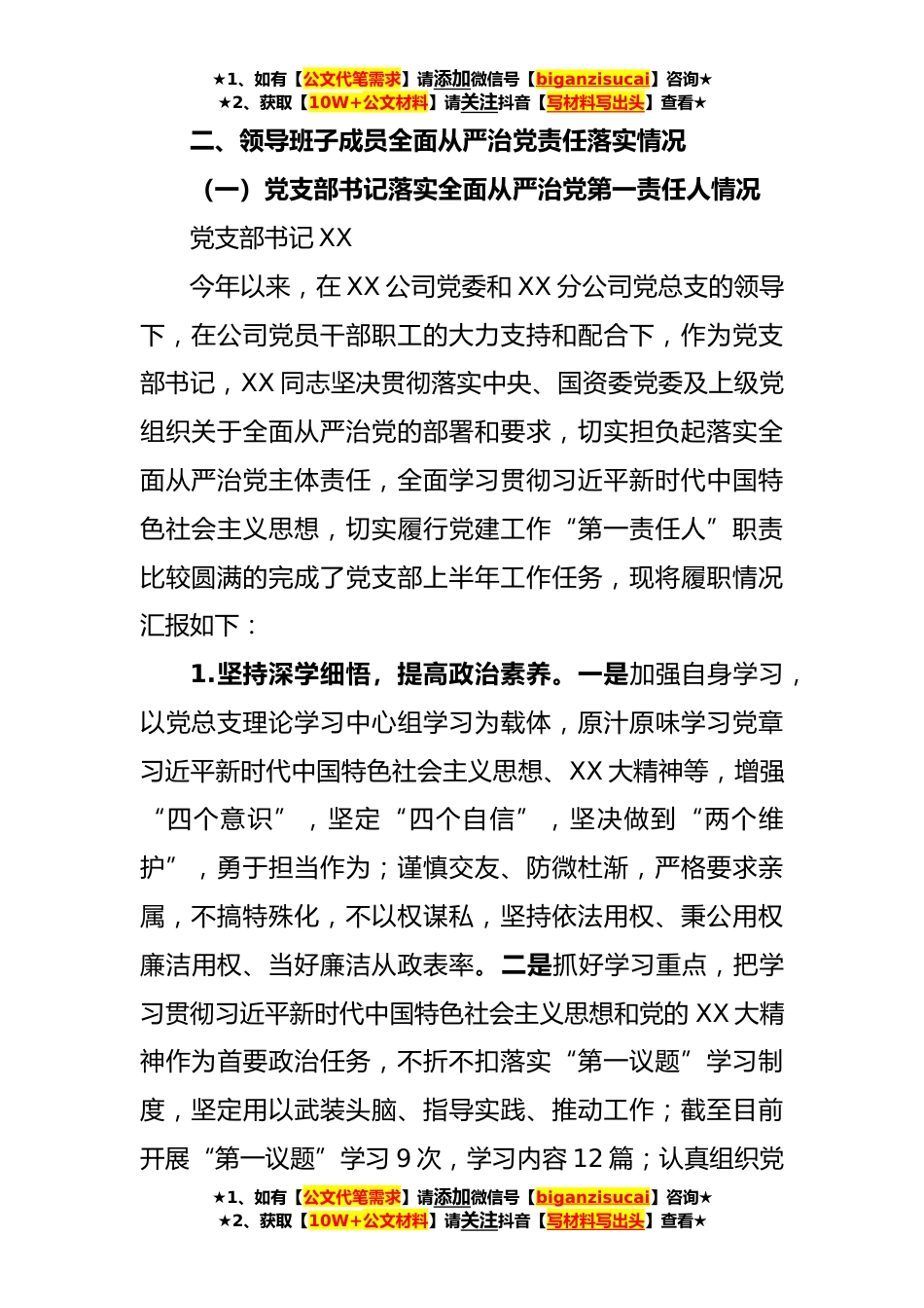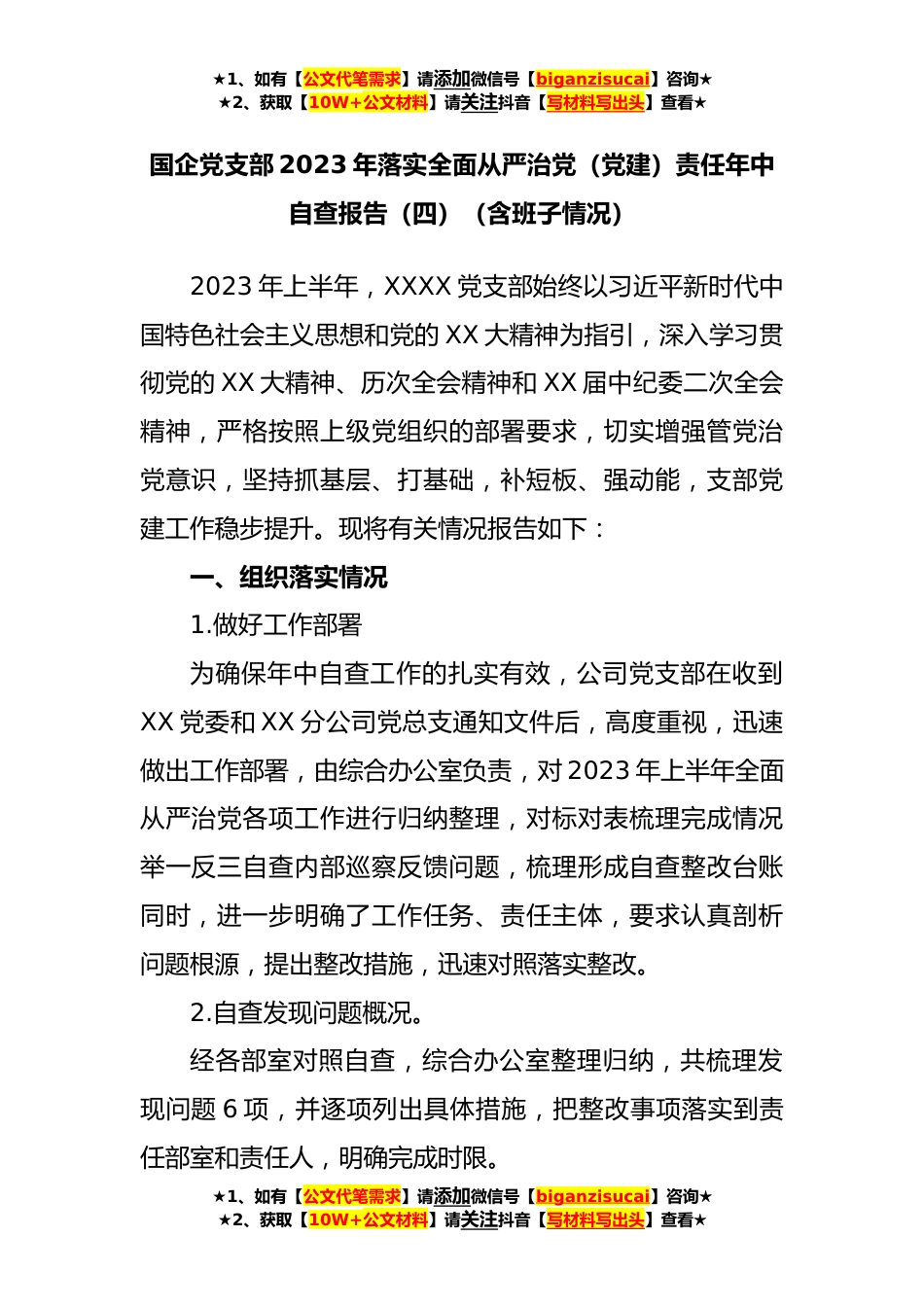 ★1、如有【公文代笔需求】请添加微信号【biganzisucai】咨询★★2、获取【10W+公文材料】请关注抖音【写材料写出头】查看★国企党支部2023年落实全面从严治党(党建)责任年中自查报告(四)(含班子情况)2023年上半年,XXXX党支部始终以习近平新时代中国特色社会主义思想和党的XX大精神为指引,深入学习贯彻党的XX大精神、历次全会精神和XX届中纪委二次全会精神,严格按照上级党组织的部署要求,切实增强管党治党意识,坚持抓基层、打基础,补短板、强动能,支部党建工作稳步提升。现将有关情况报告如下:一、组织落实情况1.做好工作部署为确保年中自查工作的扎实有效,公司党支部在收到XX党委和XX分公司党总支通知文件后,高度重视,迅速做出工作部署,由综合办公室负责,对2023年上半年全面从严治党各项工作...