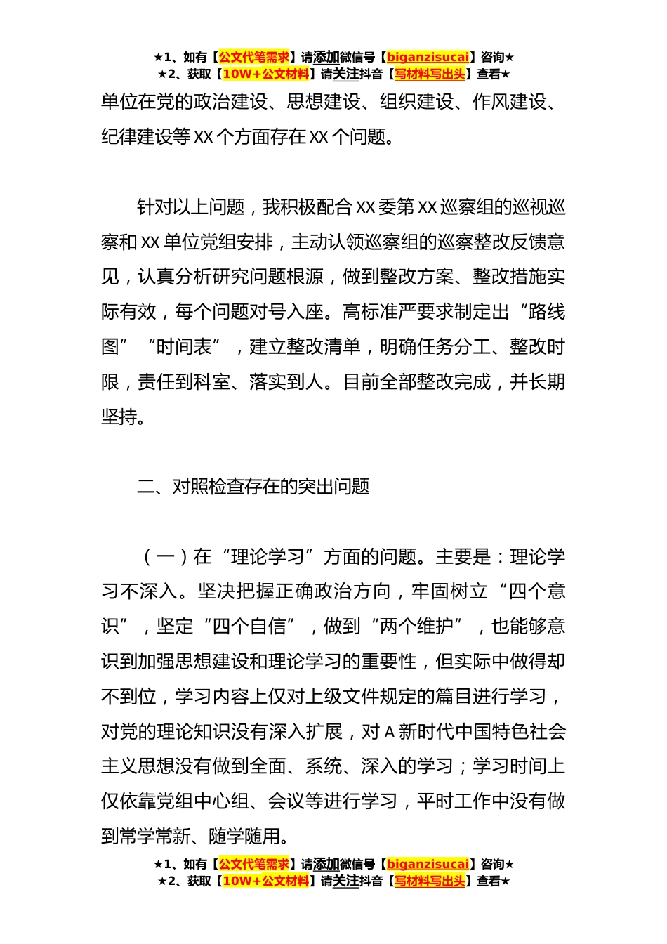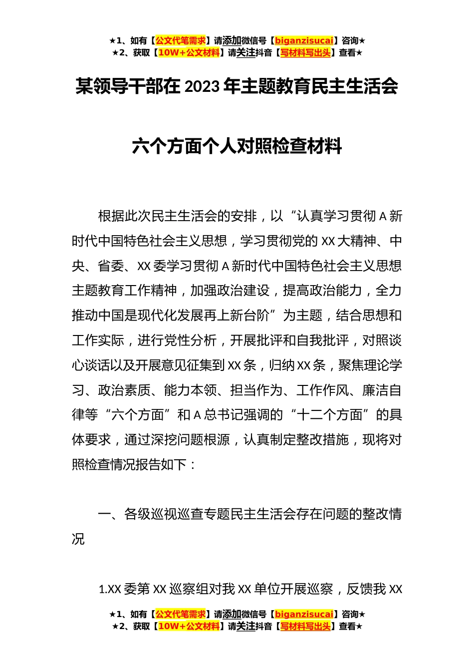 ★1、如有【公文代笔需求】请添加微信号【biganzisucai】咨询★★2、获取【10W+公文材料】请关注抖音【写材料写出头】查看★某领导干部在2023年主题教育民主生活会六个方面个人对照检查材料根据此次民主生活会的安排,以“认真学习贯彻A新时代中国特色社会主义思想,学习贯彻党的XX大精神、中央、省委、XX委学习贯彻A新时代中国特色社会主义思想主题教育工作精神,加强政治建设,提高政治能力,全力推动中国是现代化发展再上新台阶”为主题,结合思想和工作实际,进行党性分析,开展批评和自我批评,对照谈心谈话以及开展意见征集到XX条,归纳XX条,聚焦理论学习、政治素质、能力本领、担当作为、工作作风、廉洁自律等“六个方面”和A总书记强调的“十二个方面”的具体要求,通过深挖问题根源,认真制定整改措施,...
