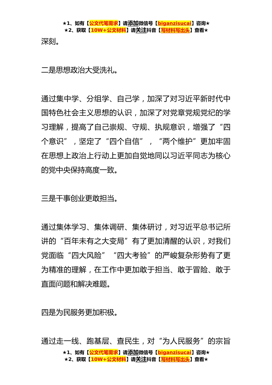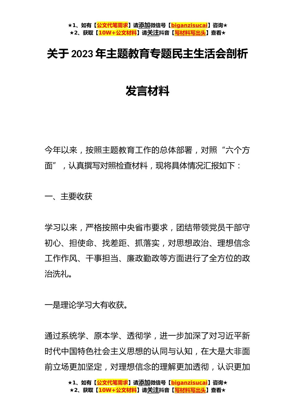 ★1、如有【公文代笔需求】请添加微信号【biganzisucai】咨询★★2、获取【10W+公文材料】请关注抖音【写材料写出头】查看★关于2023年主题教育专题民主生活会剖析发言材料今年以来,按照主题教育工作的总体部署,对照“六个方面”,认真撰写对照检查材料,现将具体情况汇报如下:一、主要收获学习以来,严格按照中央省市要求,团结带领党员干部守初心、担使命、找差距、抓落实,对思想政治、理想信念工作作风、干事担当、廉政勤政等方面进行了全方位的政治洗礼。一是理论学习大有收获。通过系统学、原本学、透彻学,进一步加深了对习近平新时代中国特色社会主义思想的认同与认知,在大是大非面前立场更加坚定,对理想信念的理解更加透彻,认识更加★1、如有【公文代笔需求】请添加微信号【biganzisucai】咨询★★...