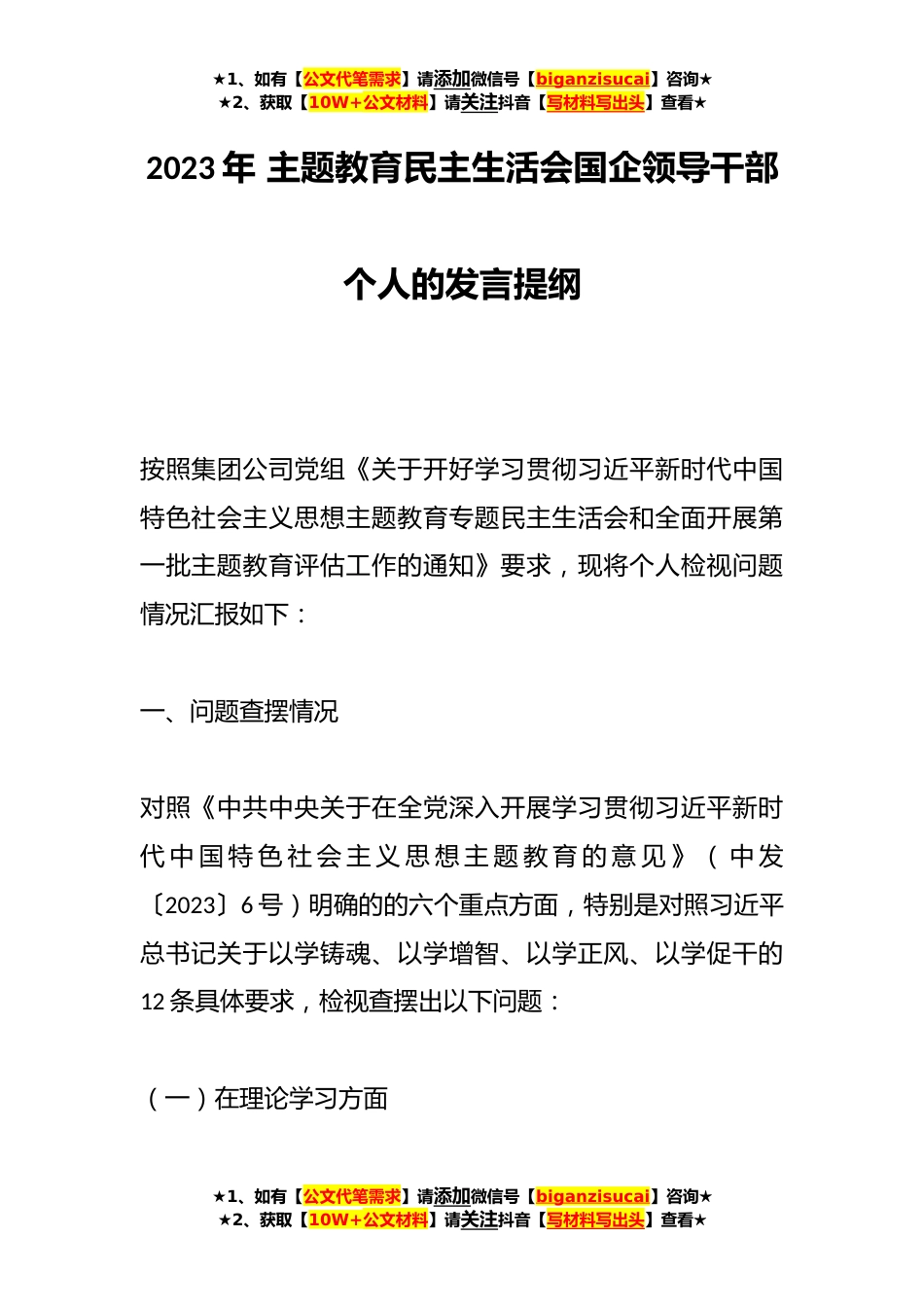 ★1、如有【公文代笔需求】请添加微信号【biganzisucai】咨询★★2、获取【10W+公文材料】请关注抖音【写材料写出头】查看★2023年主题教育民主生活会国企领导干部个人的发言提纲按照集团公司党组《关于开好学习贯彻习近平新时代中国特色社会主义思想主题教育专题民主生活会和全面开展第一批主题教育评估工作的通知》要求,现将个人检视问题情况汇报如下:一、问题查摆情况对照《中共中央关于在全党深入开展学习贯彻习近平新时代中国特色社会主义思想主题教育的意见》(中发〔2023〕6号)明确的的六个重点方面,特别是对照习近平总书记关于以学铸魂、以学增智、以学正风、以学促干的12条具体要求,检视查摆出以下问题:(一)在理论学习方面★1、如有【公文代笔需求】请添加微信号【biganzisucai】咨询★★2、获取...