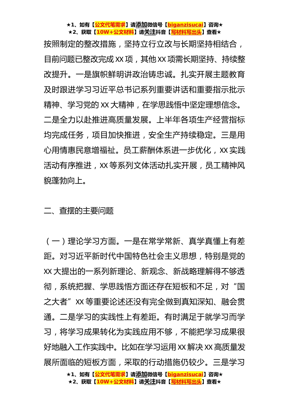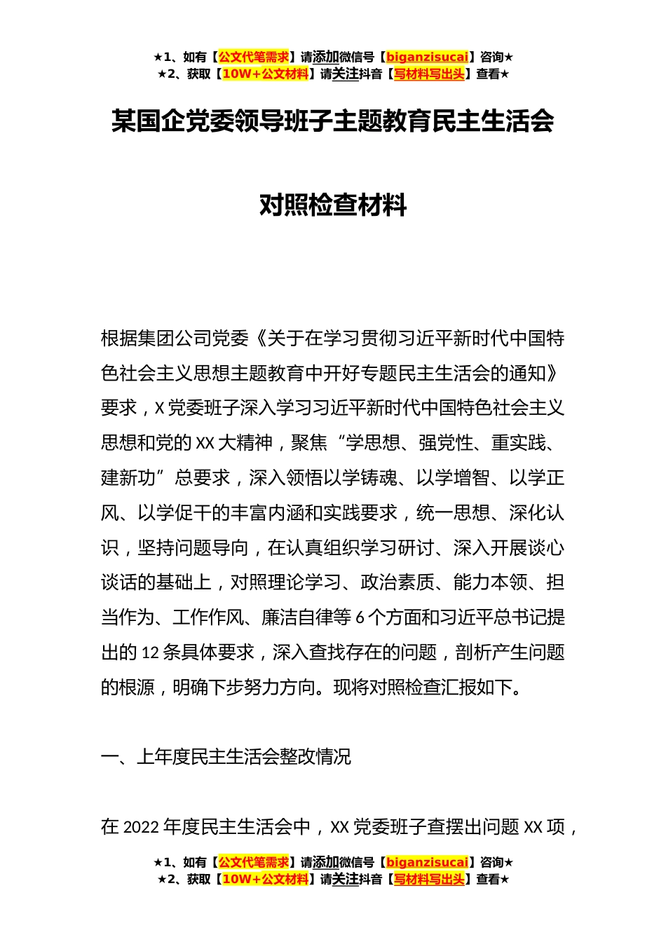 ★1、如有【公文代笔需求】请添加微信号【biganzisucai】咨询★★2、获取【10W+公文材料】请关注抖音【写材料写出头】查看★某国企党委领导班子主题教育民主生活会对照检查材料根据集团公司党委《关于在学习贯彻习近平新时代中国特色社会主义思想主题教育中开好专题民主生活会的通知》要求,X党委班子深入学习习近平新时代中国特色社会主义思想和党的XX大精神,聚焦“学思想、强党性、重实践、建新功”总要求,深入领悟以学铸魂、以学增智、以学正风、以学促干的丰富内涵和实践要求,统一思想、深化认识,坚持问题导向,在认真组织学习研讨、深入开展谈心谈话的基础上,对照理论学习、政治素质、能力本领、担当作为、工作作风、廉洁自律等6个方面和习近平总书记提出的12条具体要求,深入查找存在的问题,剖析产生...