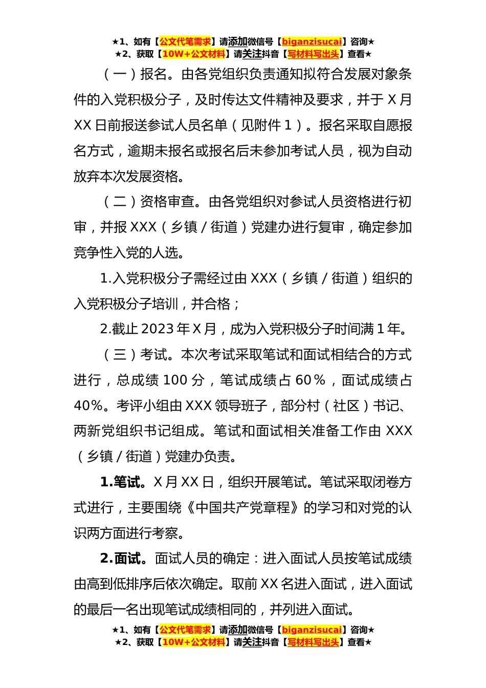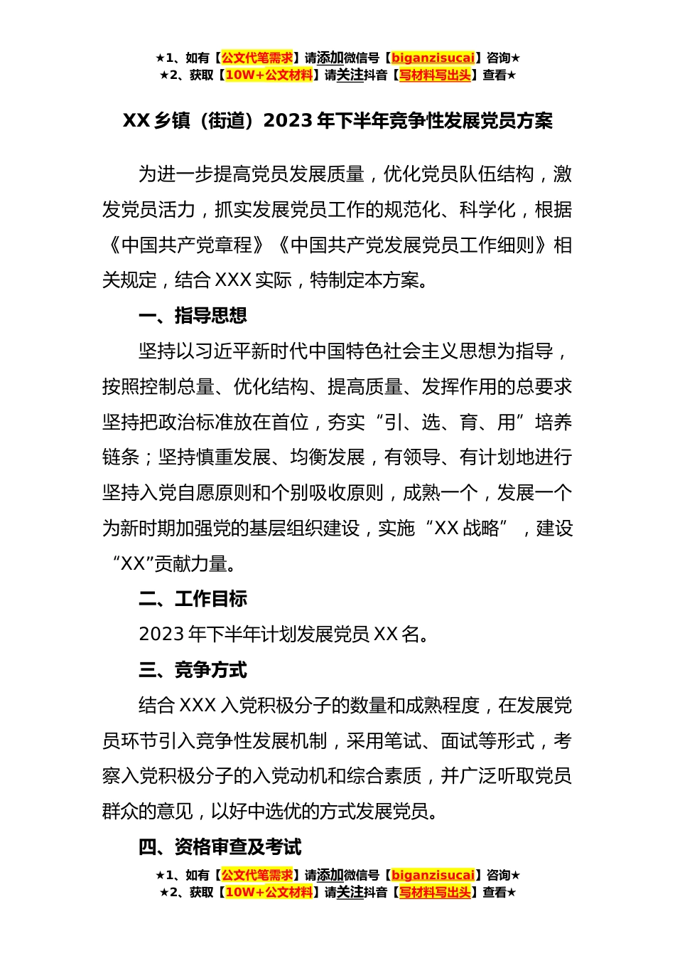 ★1、如有【公文代笔需求】请添加微信号【biganzisucai】咨询★★2、获取【10W+公文材料】请关注抖音【写材料写出头】查看★XX乡镇(街道)2023年下半年竞争性发展党员方案为进一步提高党员发展质量,优化党员队伍结构,激发党员活力,抓实发展党员工作的规范化、科学化,根据《中国共产党章程》《中国共产党发展党员工作细则》相关规定,结合XXX实际,特制定本方案。一、指导思想坚持以习近平新时代中国特色社会主义思想为指导,按照控制总量、优化结构、提高质量、发挥作用的总要求坚持把政治标准放在首位,夯实“引、选、育、用”培养链条;坚持慎重发展、均衡发展,有领导、有计划地进行坚持入党自愿原则和个别吸收原则,成熟一个,发展一个为新时期加强党的基层组织建设,实施“XX战略”,建设“XX”贡献力量...