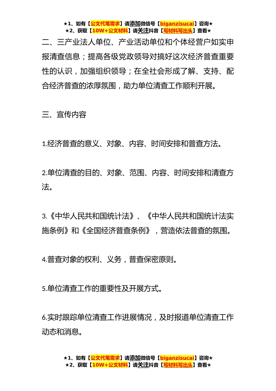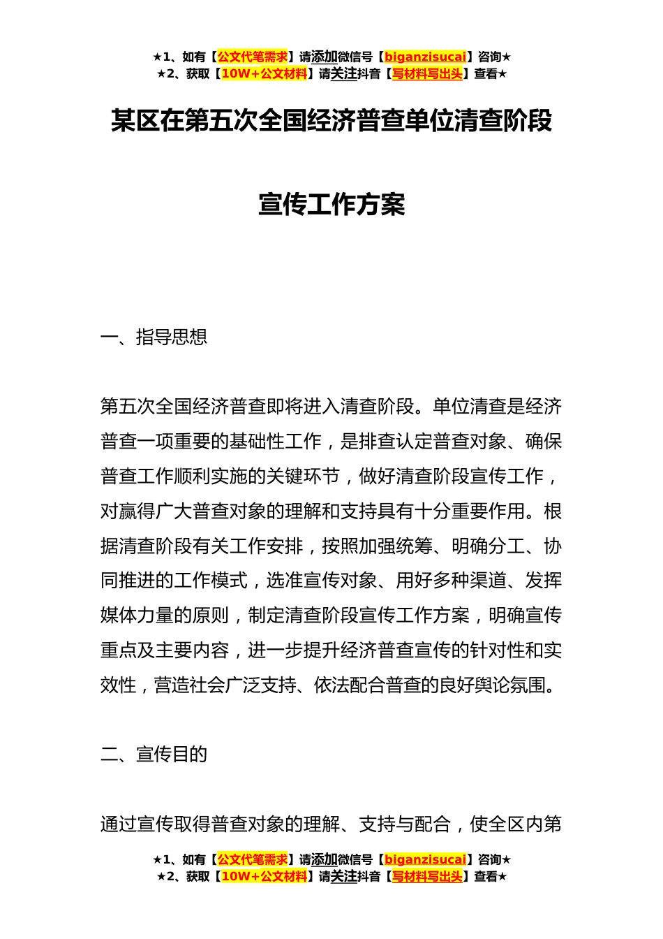 ★1、如有【公文代笔需求】请添加微信号【biganzisucai】咨询★★2、获取【10W+公文材料】请关注抖音【写材料写出头】查看★某区在第五次全国经济普查单位清查阶段宣传工作方案一、指导思想第五次全国经济普查即将进入清查阶段。单位清查是经济普查一项重要的基础性工作,是排查认定普查对象、确保普查工作顺利实施的关键环节,做好清查阶段宣传工作,对赢得广大普查对象的理解和支持具有十分重要作用。根据清查阶段有关工作安排,按照加强统筹、明确分工、协同推进的工作模式,选准宣传对象、用好多种渠道、发挥媒体力量的原则,制定清查阶段宣传工作方案,明确宣传重点及主要内容,进一步提升经济普查宣传的针对性和实效性,营造社会广泛支持、依法配合普查的良好舆论氛围。二、宣传目的通过宣传取得普查对象的...