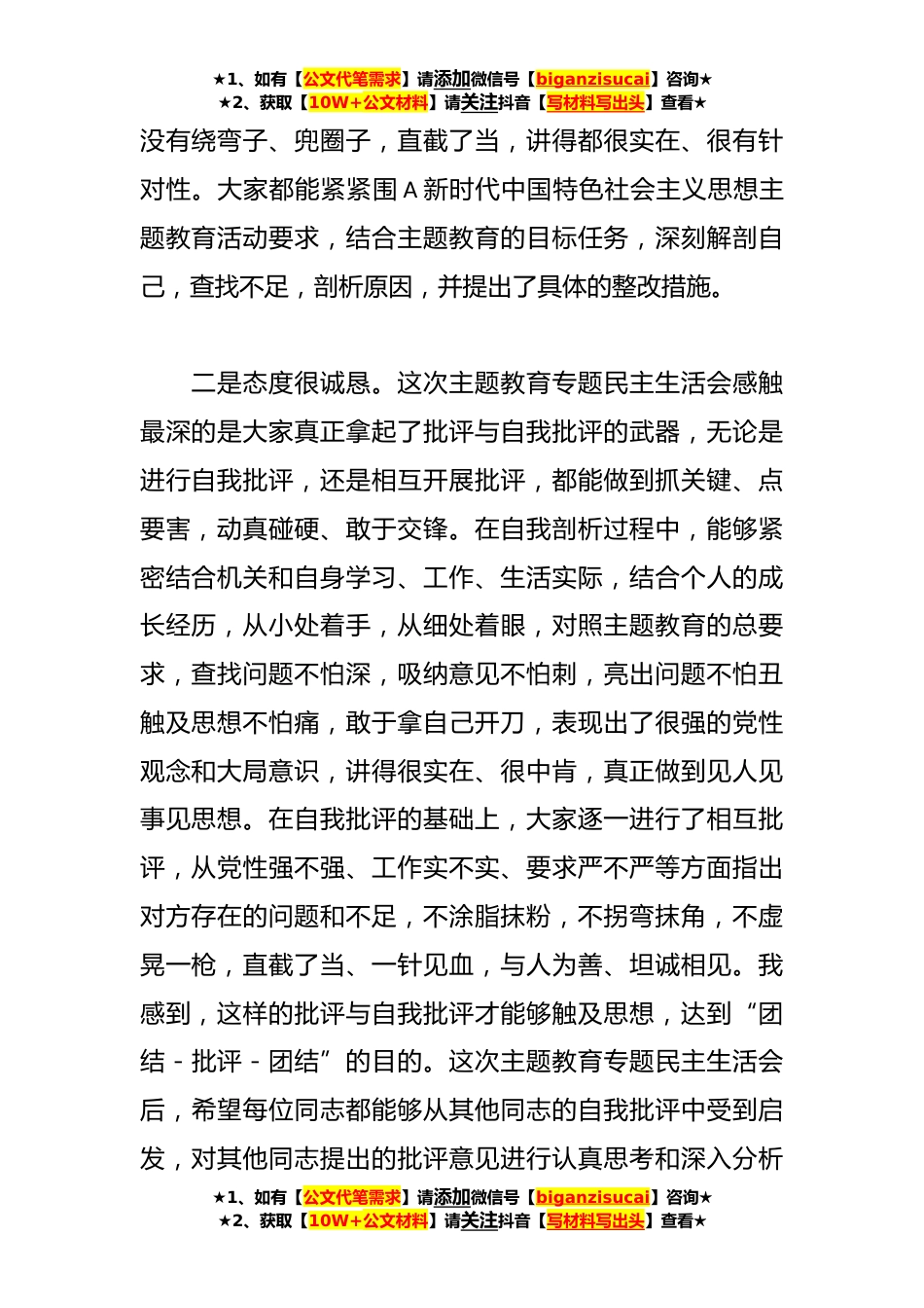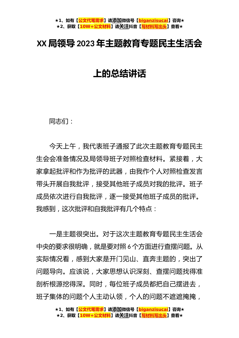 ★1、如有【公文代笔需求】请添加微信号【biganzisucai】咨询★★2、获取【10W+公文材料】请关注抖音【写材料写出头】查看★XX局领导2023年主题教育专题民主生活会上的总结讲话同志们:今天上午,我代表班子通报了此次主题教育专题民主生会会准备情况及局领导班子对照检查材料。紧接着,大家拿起批评和作为批评的武器,由我作个人对照检查发言带头开展自我批评,接受其他班子成员对我的批评。班子成员依次进行自我批评,逐一接受其他班子成员的批评。我感到,这次批评和自我批评有几个特点:一是主题很突出。对于这次主题教育专题民主生活会中央的要求很明确,就是要对照6个方面进行查摆问题。从实际情况看,感到大家是开门见山、直奔主题的,突出了问题导向。应该说,大家思想认识深刻、查摆问题找得准剖析根源挖...