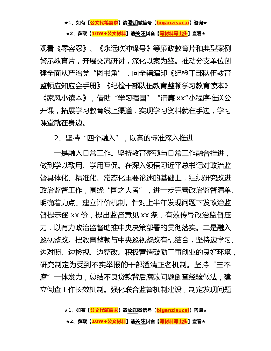 ★1、如有【公文代笔需求】请添加微信号【biganzisucai】咨询★★2、获取【10W+公文材料】请关注抖音【写材料写出头】查看★集团2023年纪检干部队伍教育整顿阶段性工作总结纪检干部队伍教育整顿工作开展以来,在集团党委的坚强领导下,集团纪委主动提升政治站位,精心安排部署,从严抓实抓紧,推动教育整顿扎实开展。1、强化政治引领,以严的基调一贯到底一是提升政治站位,一体谋划推进。集团纪委把教育整顿作为重大政治任务来抓,深入学习习近平新时代中国特色社会主义思想和习近平总书记来陕考察重要指示,传承xx红色基因,从延安精神中汲取力量,持续增强教育整顿政治自觉、思想自觉、行动自觉。对教育整顿一体谋划、一体推动,提出坚持“四个融入”做到“五个强化”工作要求,保证教育整顿深入扎实、步调一致...