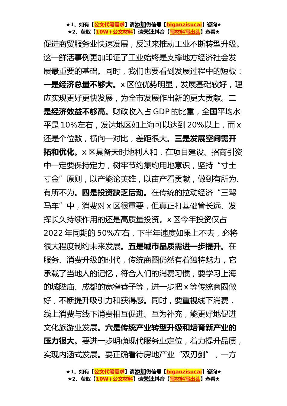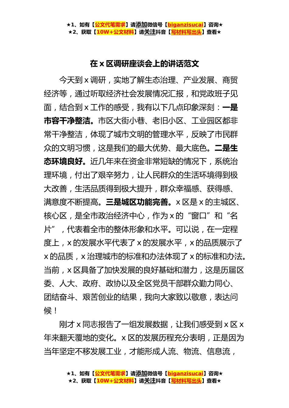 ★1、如有【公文代笔需求】请添加微信号【biganzisucai】咨询★★2、获取【10W+公文材料】请关注抖音【写材料写出头】查看★在x区调研座谈会上的讲话范文今天到x调研,实地了解生态治理、产业发展、商贸经济等,通过听取经济社会发展情况汇报,和党政班子见面,结合到x工作的感受,我有以下几点印象深刻:一是市容干净整洁。市区大街小巷、老旧小区、工业园区都非常干净整洁,体现了城市文明的管理水平,反映了市民群众的文明习惯,这是我们的最大优势、最大底色。二是生态环境良好。近几年来在资金非常短缺的情况下,系统治理环境,付出了艰辛努力,让人民群众的生活环境得到极大改善,生活品质得到极大提升,群众幸福感、获得感、满意度不断提高。三是城区功能完善。x区是x的主城区、核心区,是全市政治经济中心...