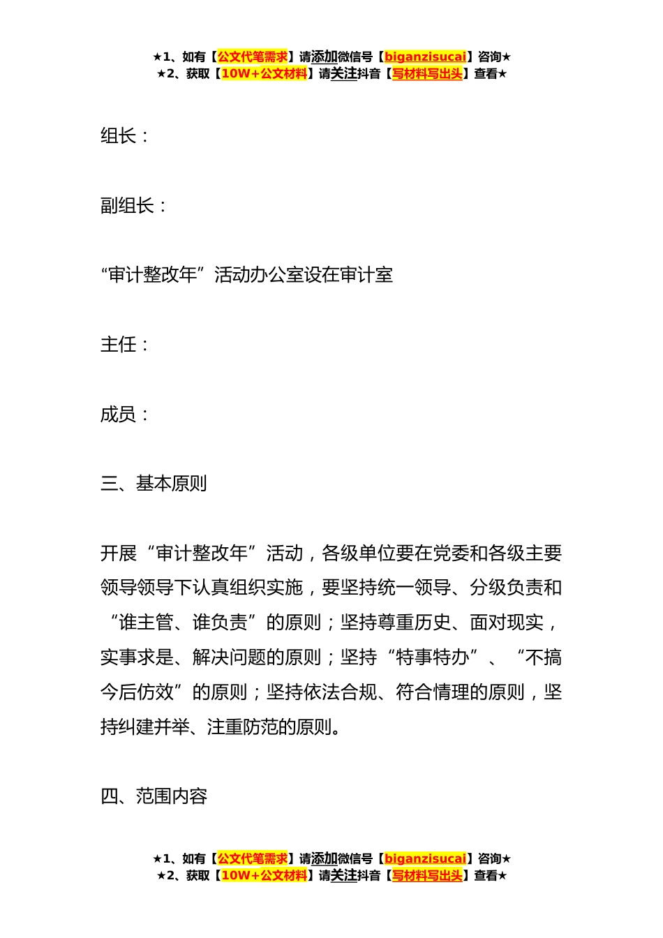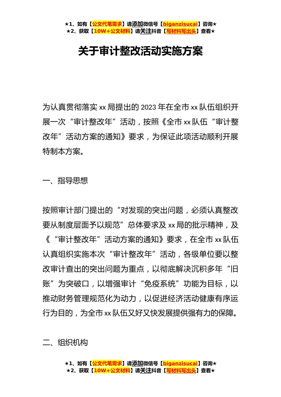 ★1、如有【公文代笔需求】请添加微信号【biganzisucai】咨询★★2、获取【10W+公文材料】请关注抖音【写材料写出头】查看★关于审计整改活动实施方案为认真贯彻落实xx局提出的2023年在全市xx队伍组织开展一次“审计整改年”活动,按照《全市xx队伍“审计整改年”活动方案的通知》要求,为保证此项活动顺利开展特制本方案。一、指导思想按照审计部门提出的“对发现的突出问题,必须认真整改要从制度层面予以规范”总体要求及xx局的批示精神,及《“审计整改年”活动方案的通知》要求,在全市xx队伍认真组织实施本次“审计整改年”活动,各级单位要以整改审计查出的突出问题为重点,以彻底解决沉积多年“旧账”为突破口,以增强审计“免疫系统”功能为目标,以推动财务管理规范化为动力,以促进经济活动健康有序运...