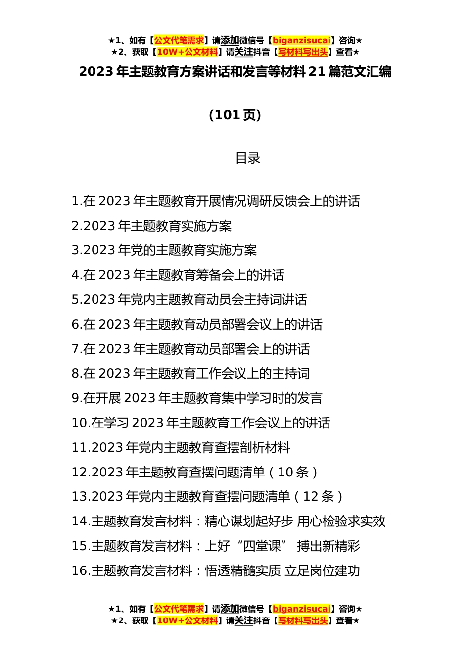 ★1、如有【公文代笔需求】请添加微信号【biganzisucai】咨询★★2、获取【10W+公文材料】请关注抖音【写材料写出头】查看★2023年主题教育方案讲话和发言等材料21篇范文汇编(101页)目录1.在2023年主题教育开展情况调研反馈会上的讲话2.2023年主题教育实施方案3.2023年党的主题教育实施方案4.在2023年主题教育筹备会上的讲话5.2023年党内主题教育动员会主持词讲话6.在2023年主题教育动员部署会议上的讲话7.在2023年主题教育动员部署会上的讲话8.在2023年主题教育工作会议上的主持词9.在开展2023年主题教育集中学习时的发言10.在学习2023年主题教育工作会议上的讲话11.2023年党内主题教育查摆剖析材料12.2023年主题教育查摆问题清单(10条)13.2023年党内主题教育查摆问题清单(12条)14.主题教育发言材料:精心...