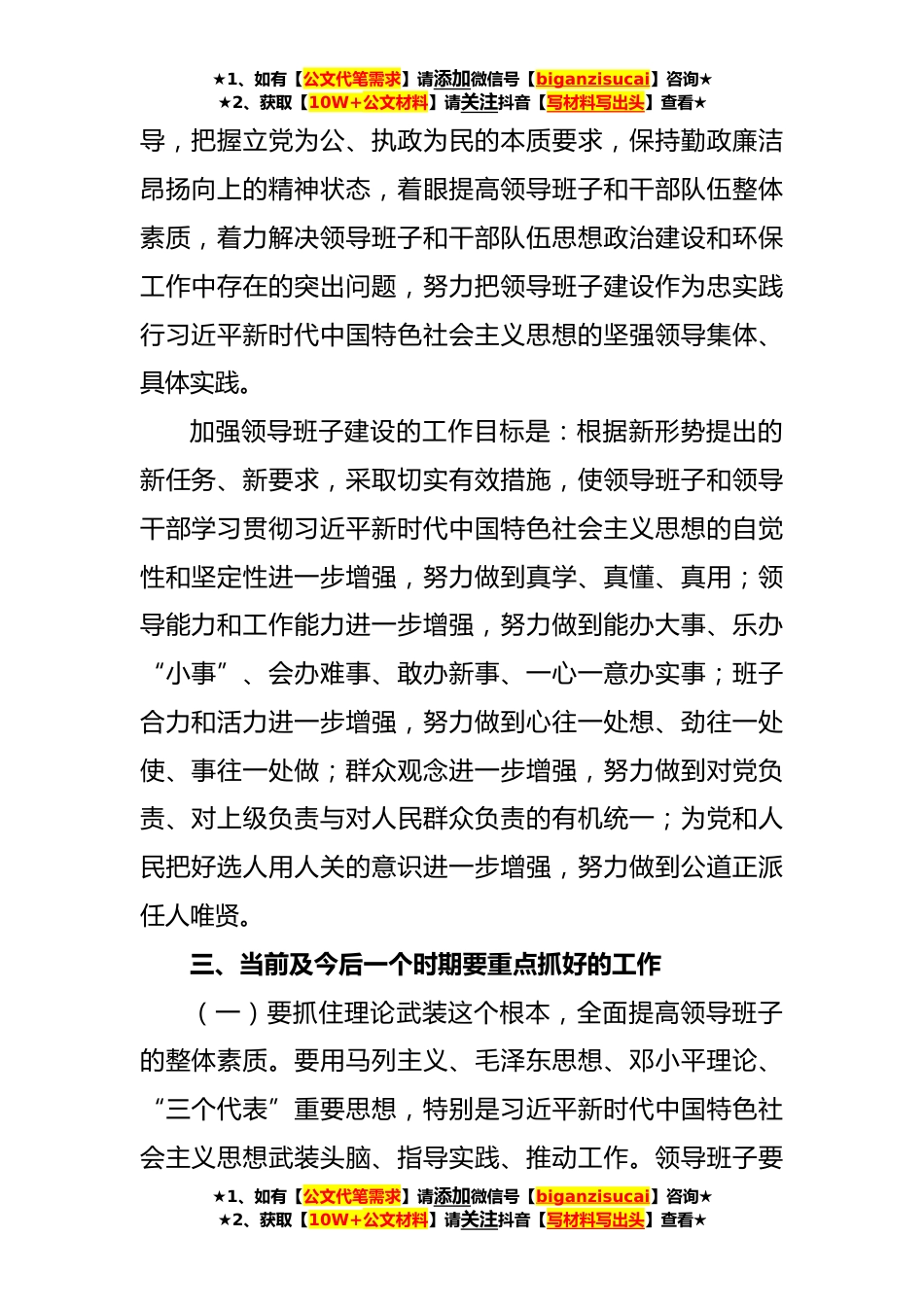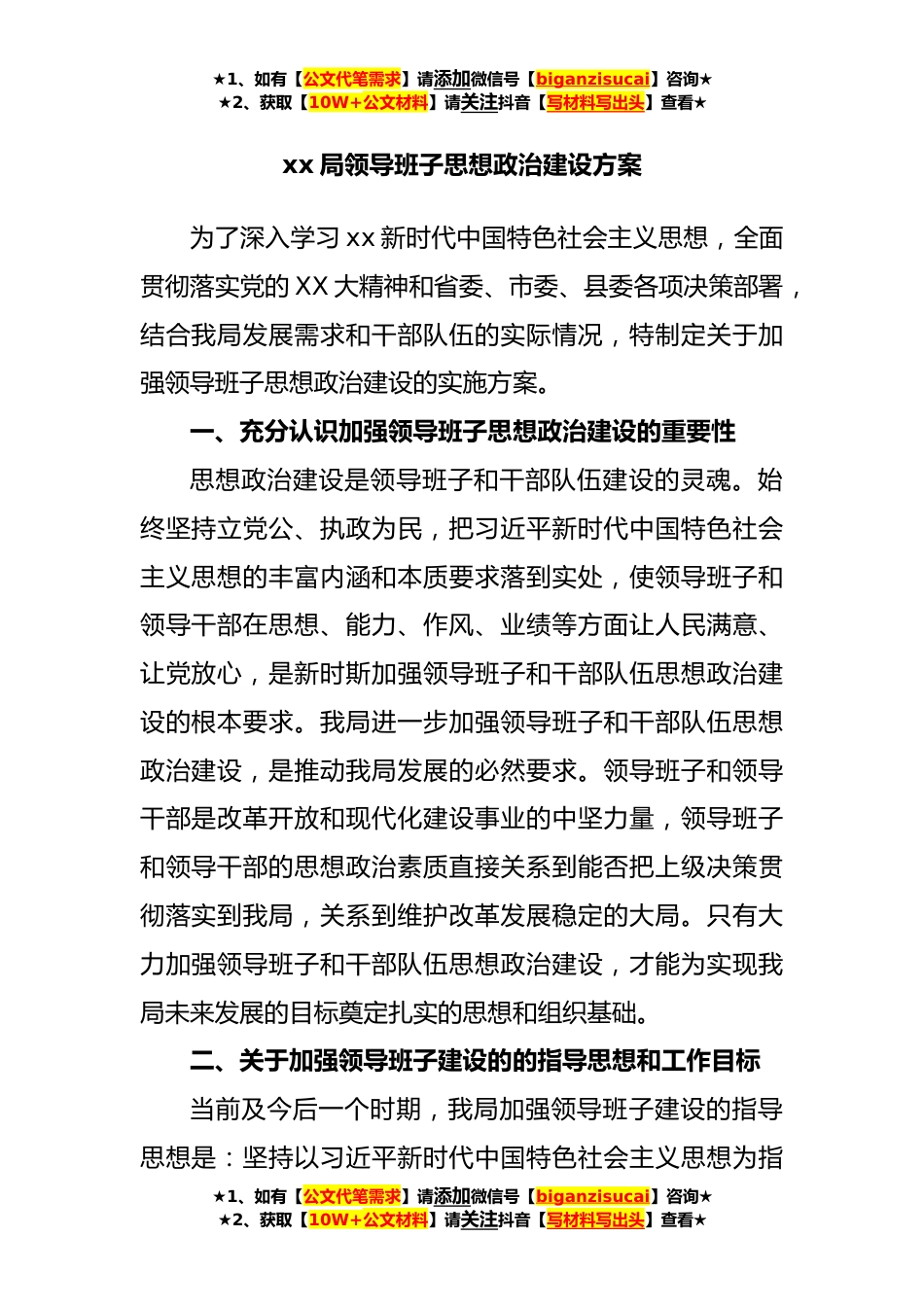 ★1、如有【公文代笔需求】请添加微信号【biganzisucai】咨询★★2、获取【10W+公文材料】请关注抖音【写材料写出头】查看★xx局领导班子思想政治建设方案为了深入学习xx新时代中国特色社会主义思想,全面贯彻落实党的XX大精神和省委、市委、县委各项决策部署,结合我局发展需求和干部队伍的实际情况,特制定关于加强领导班子思想政治建设的实施方案。一、充分认识加强领导班子思想政治建设的重要性思想政治建设是领导班子和干部队伍建设的灵魂。始终坚持立党公、执政为民,把习近平新时代中国特色社会主义思想的丰富内涵和本质要求落到实处,使领导班子和领导干部在思想、能力、作风、业绩等方面让人民满意、让党放心,是新时斯加强领导班子和干部队伍思想政治建设的根本要求。我局进一步加强领导班子和干部队伍...