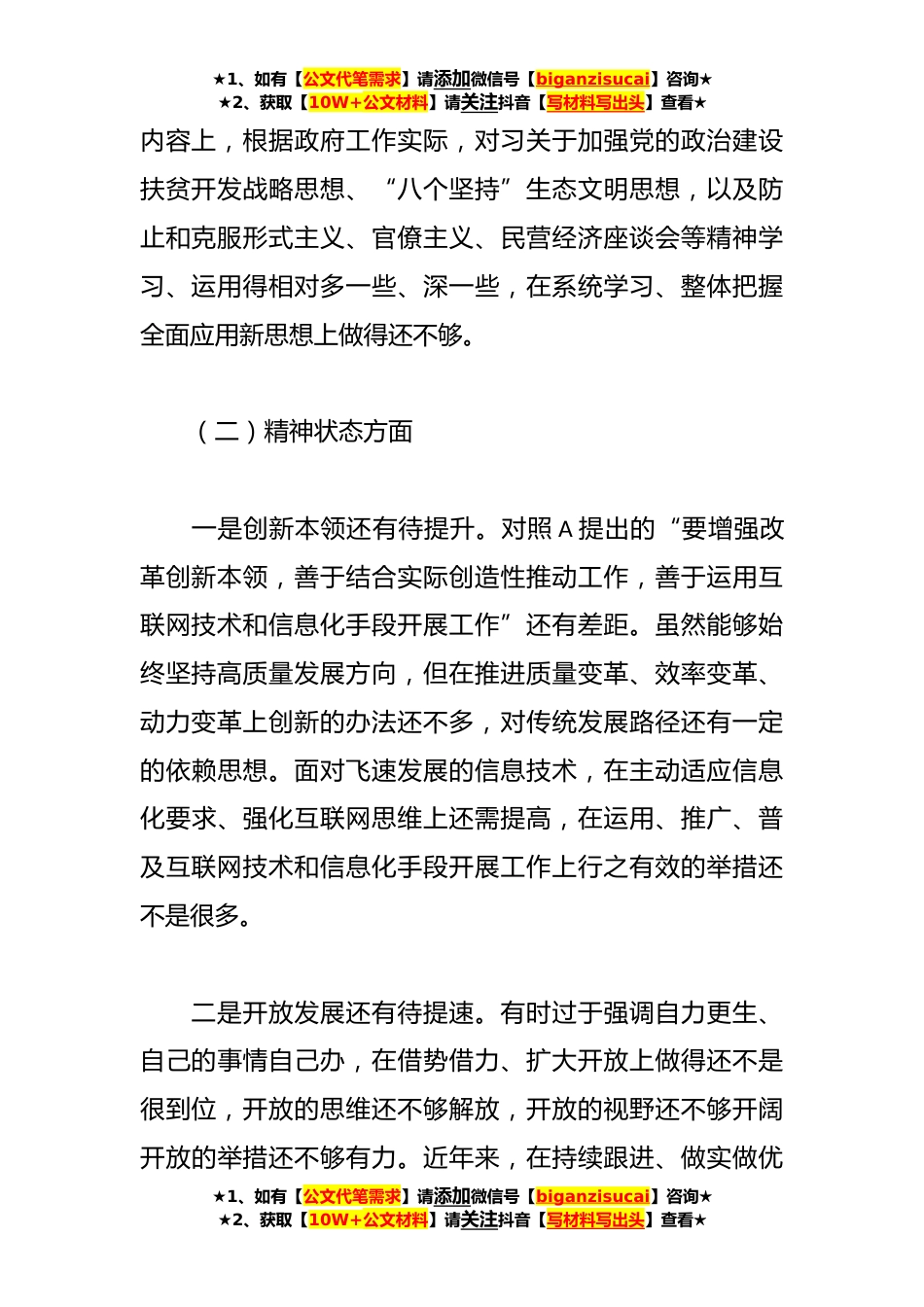 ★1、如有【公文代笔需求】请添加微信号【biganzisucai】咨询★★2、获取【10W+公文材料】请关注抖音【写材料写出头】查看★XX县长主题教育民主生活会个人发言提纲根据市委统一安排,结合学习新时代中国特色社会主义思想和党的二十大精神等,对照党章党纪,在深入走访基层党员干部群众,广泛听取班子成员及相关同志意见建议的基础上,认真查找了个人存在的问题,并深刻剖析了思想根源,明确了整改措施和今后努力的方向,现报告如下:一、存在的问题(一)思想政治方面对新时代中国特色社会主义思想的学习、理解还比较零散、微观,对其鲜明的时代性、严密的系统性、深邃的科学性、强大的实践性等方面思考还不是很深入、细致,在深刻领会、系统把握、融会贯通上还有欠缺。在学习形式上,比较注重集体传达学习和个人...