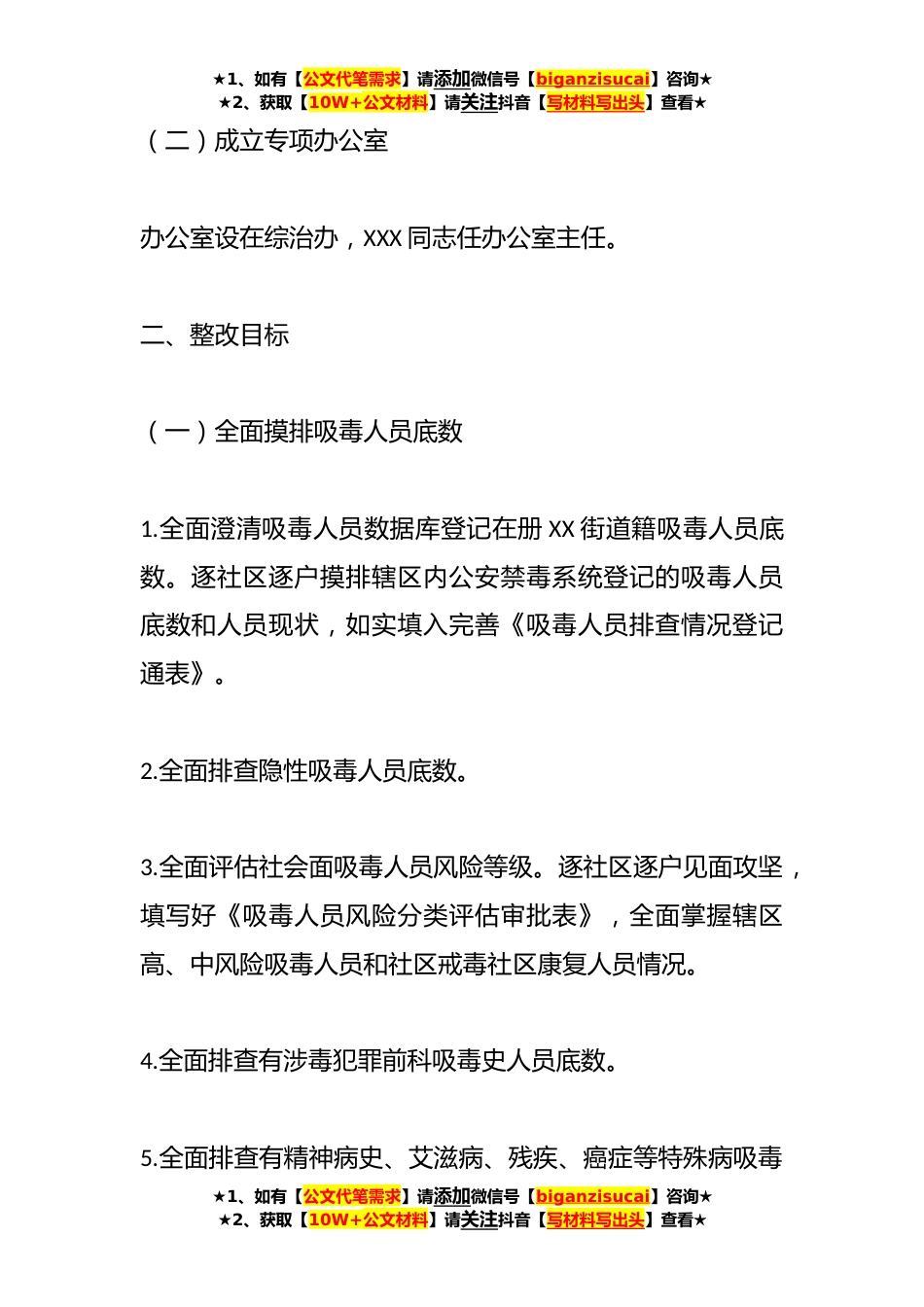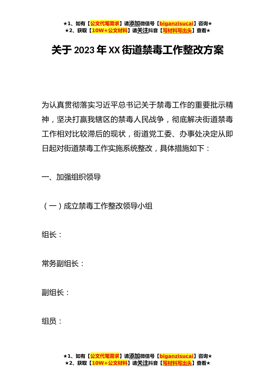 ★1、如有【公文代笔需求】请添加微信号【biganzisucai】咨询★★2、获取【10W+公文材料】请关注抖音【写材料写出头】查看★关于2023年XX街道禁毒工作整改方案为认真贯彻落实习近平总书记关于禁毒工作的重要批示精神,坚决打赢我辖区的禁毒人民战争,彻底解决街道禁毒工作相对比较滞后的现状,街道党工委、办事处决定从即日起对街道禁毒工作实施系统整改,具体措施如下:一、加强组织领导(一)成立禁毒工作整改领导小组组长:常务副组长:副组长:组员:★1、如有【公文代笔需求】请添加微信号【biganzisucai】咨询★★2、获取【10W+公文材料】请关注抖音【写材料写出头】查看★★1、如有【公文代笔需求】请添加微信号【biganzisucai】咨询★★2、获取【10W+公文材料】请关注抖音【写材料写出头】查看★(二)成...
