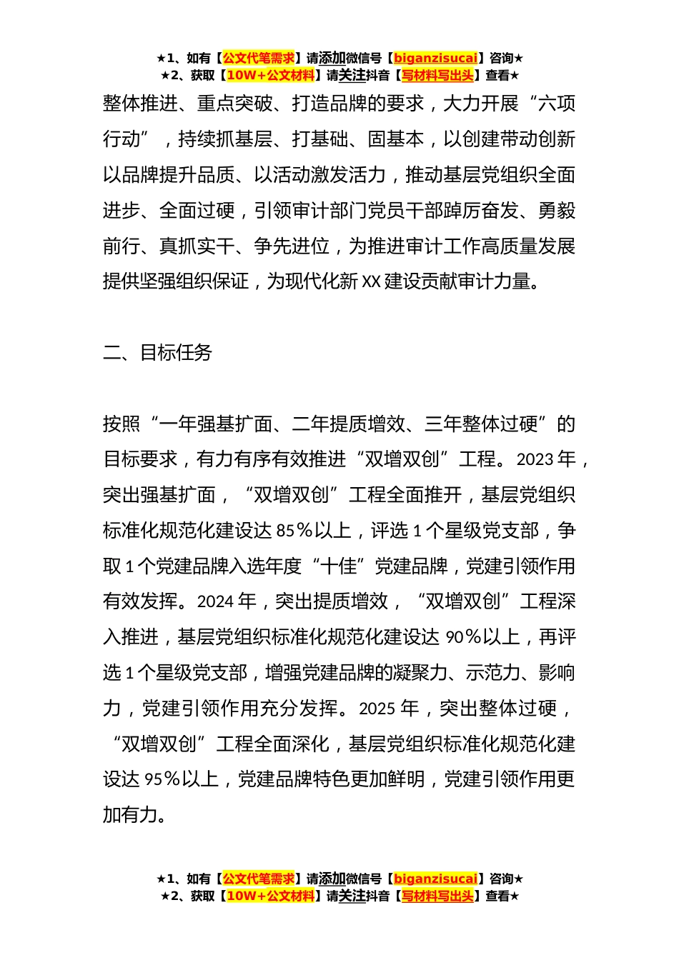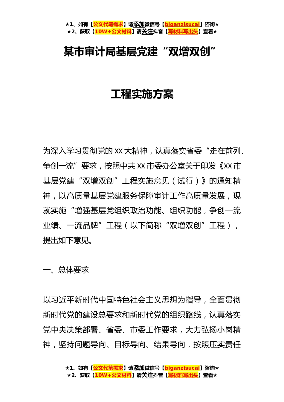 ★1、如有【公文代笔需求】请添加微信号【biganzisucai】咨询★★2、获取【10W+公文材料】请关注抖音【写材料写出头】查看★某市审计局基层党建“双增双创”工程实施方案为深入学习贯彻党的XX大精神,认真落实省委“走在前列、争创一流”要求,按照中共XX市委办公室关于印发《XX市基层党建“双增双创”工程实施意见(试行)》的通知精神,以高质量基层党建服务保障审计工作高质量发展,现就实施“增强基层党组织政治功能、组织功能,争创一流业绩、一流品牌”工程(以下简称“双增双创”工程),提出如下意见。一、总体要求以习近平新时代中国特色社会主义思想为指导,全面贯彻新时代党的建设总要求和新时代党的组织路线,认真落实党中央决策部署、省委、市委工作要求,大力弘扬小岗精神,坚持问题导向、目标导向...