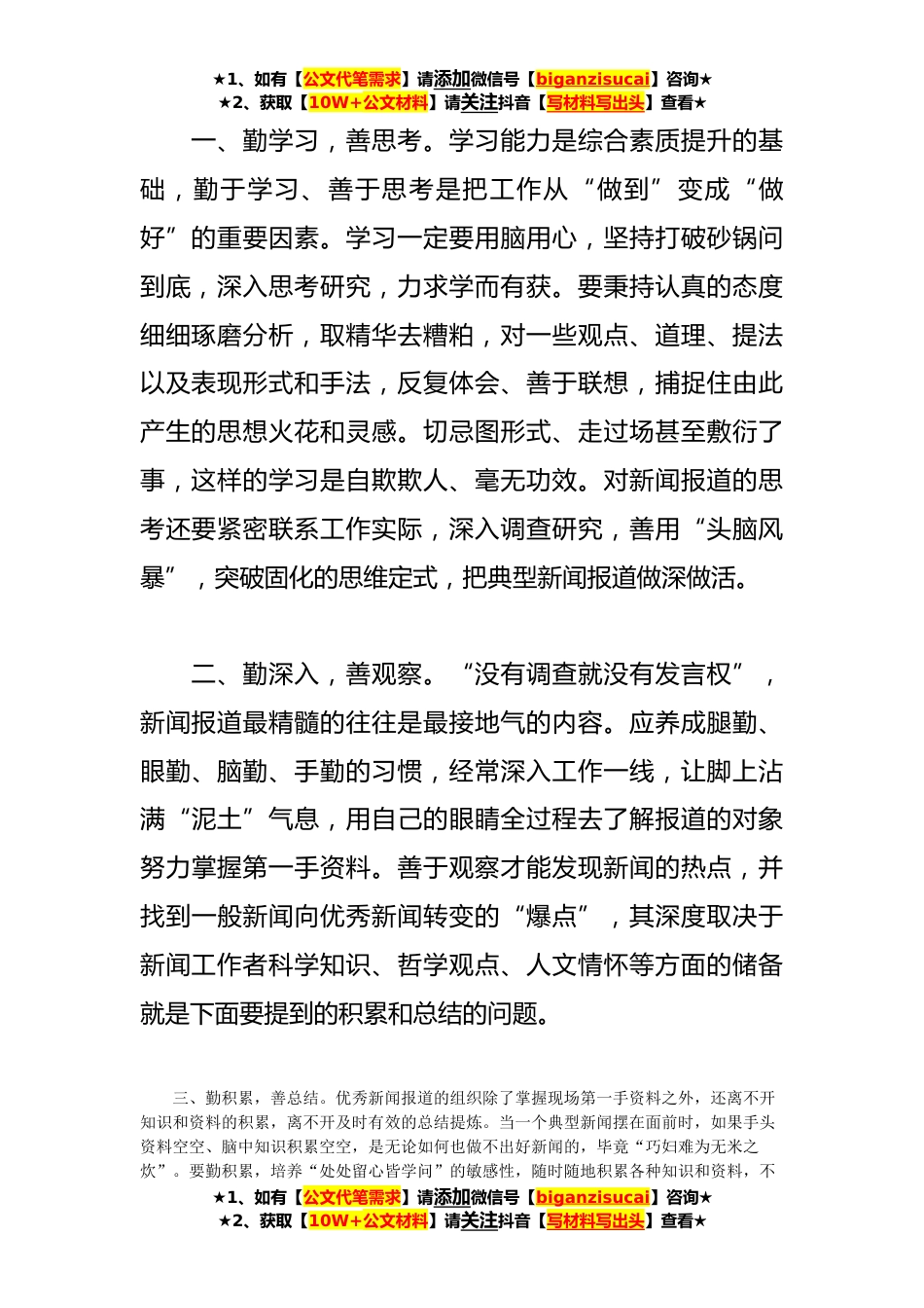★1、如有【公文代笔需求】请添加微信号【biganzisucai】咨询★★2、获取【10W+公文材料】请关注抖音【写材料写出头】查看★某国企宣传人员在新闻报道专题培训学习感悟:功夫在诗外笃行方致远2023年×月×日,在第四期×大讲堂有幸听到了由×文化中心×老师讲授的《×》培训课程,收获颇丰、受益匪浅。课上讲到要从×、×、×以及×四个方面切入做深做活典型报道。“今天的苦果,是昨天的伏笔;当下的付出,才是明日的花开”,×老师的这句分享让我对如何做好宣传工作有了更深刻的理解,“功夫在诗外,笃行方致远”,相信通过孜孜不倦汲取养分,静待花开终将有期。做深做活典型报道是一个人甚至一个团队综合素质的反映,靠闭门造车、就报道做报道,思维方式将会固化,即便费力再多也难以做出好的典型报道。这个综...