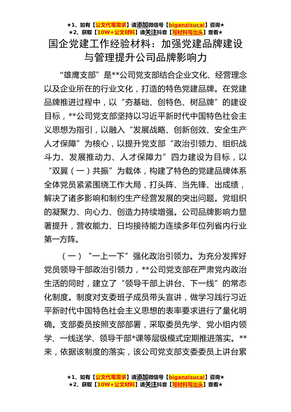 ★1、如有【公文代笔需求】请添加微信号【biganzisucai】咨询★★2、获取【10W+公文材料】请关注抖音【写材料写出头】查看★★1、如有【公文代笔需求】请添加微信号【biganzisucai】咨询★★2、获取【10W+公文材料】请关注抖音【写材料写出头】查看★★1、如有【公文代笔需求】请添加微信号【biganzisucai】咨询★★2、获取【10W+公文材料】请关注抖音【写材料写出头】查看★国企党建工作经验材料:加强党建品牌建设与管理提升公司品牌影响力“雄鹰支部”是**公司党支部结合企业文化、经营理念以及企业所在的行业文化,打造的特色党建品牌。在党建品牌推进过程中,以“夯基础、创特色、树品牌”的建设目标,**公司党支部坚持以习近平新时代中国特色社会主义思想为指引,以融入“发展战略、创新创效、安全生产人才...
