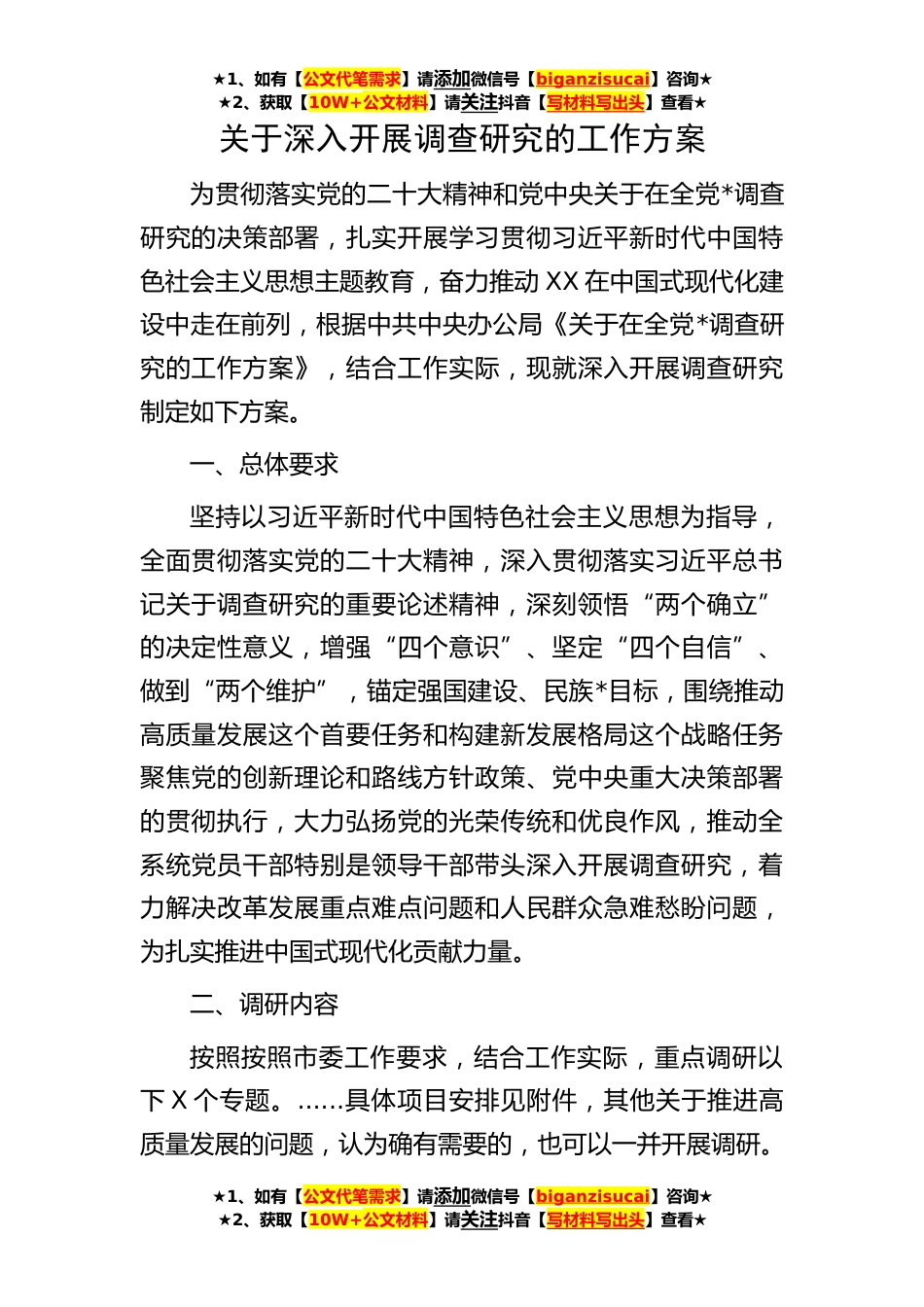 ★1、如有【公文代笔需求】请添加微信号【biganzisucai】咨询★★2、获取【10W+公文材料】请关注抖音【写材料写出头】查看★★1、如有【公文代笔需求】请添加微信号【biganzisucai】咨询★★2、获取【10W+公文材料】请关注抖音【写材料写出头】查看★★1、如有【公文代笔需求】请添加微信号【biganzisucai】咨询★★2、获取【10W+公文材料】请关注抖音【写材料写出头】查看★关于深入开展调查研究的工作方案为贯彻落实党的二十大精神和党中央关于在全党*调查研究的决策部署,扎实开展学习贯彻习近平新时代中国特色社会主义思想主题教育,奋力推动XX在中国式现代化建设中走在前列,根据中共中央办公局《关于在全党*调查研究的工作方案》,结合工作实际,现就深入开展调查研究制定如下方案。一、总体要求坚持以习近...